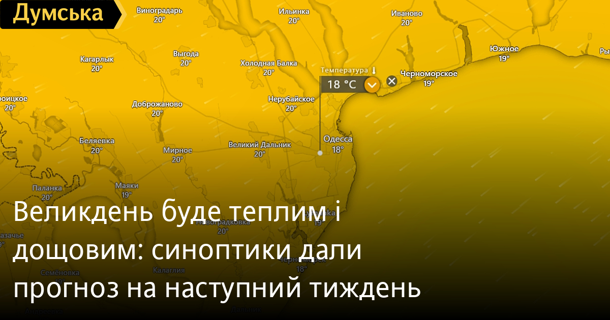 Великдень буде теплим і дощовим: синоптики дали прогноз на наступний тижденьВеликдень в Одесі обіцяє бути дощовим, але теплим — із температурою повітря трохи вищою за норму. Про це «Думській» розповіла керівниця відділу метеопрогнозів Гідрометеоцентру Чорного та Азовського морів Олена Тарнавська. За її словами, похолодання із заморозками накриє західні та північні регіони нашої країни, в Одеській області збережеться тепла погода. «Завтра, 1 травня, в Одесі очікується +20 +22°С, по області +20 +25°С, без опадів. Починаючи з 2-3 травня, у нашому регіоні почнуться дощі, місцями прогримлять грози», — розповіла Олена Тарнавська. Вона також підкреслила, що весь тиждень буде дощовим, включно з неділею, 5 травня. «Погода на 4-5 травня — вітер не штормовий, 7-10 метрів на секунду, температура вночі+9 +14°С, вдень +17 +22°С». Фахівець також зазначила, що середньодобові температури перевищують норму в середньому на 3-4 градуси. Помітили помилку? Виділяйте слова з помилкою та натискайте control-enter |