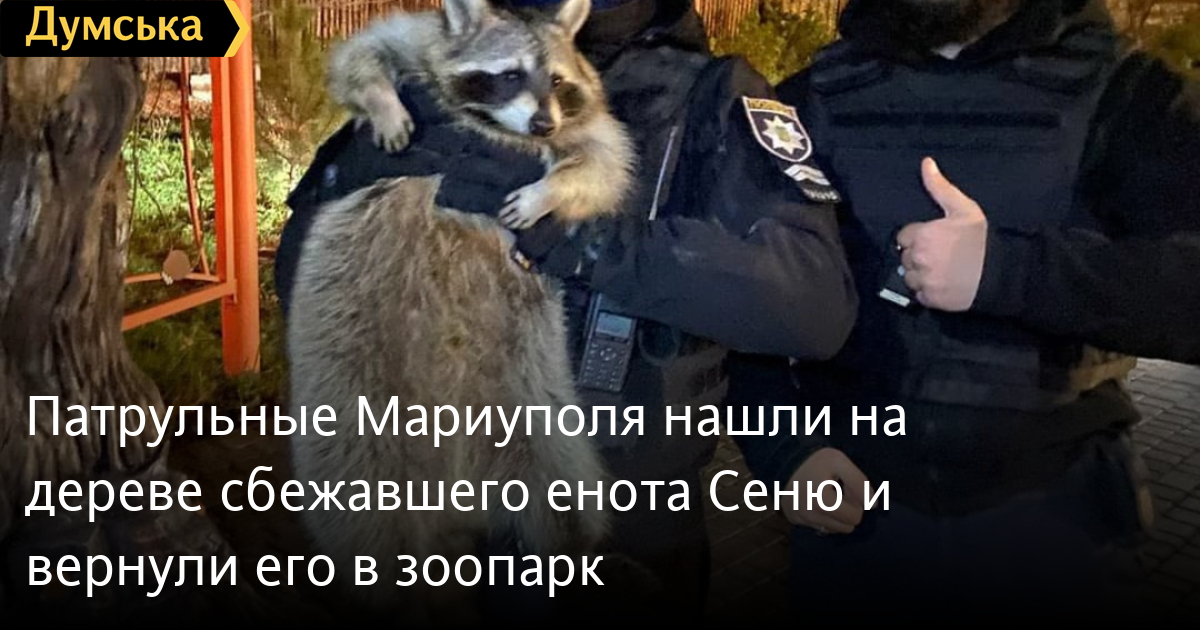 Патрульные Мариуполя нашли на дереве сбежавшего енота Сеню и вернули его в зоопаркСбежавшего из мариупольского зоопарка енота по кличке Сеня нашли невредимым на дереве и вернули обратно в зверинец. Историей спасения животного поделилась Патрульная полиция Украины в своем телеграм-канале. Жители сообщили на 102, что животное сидит на дереве. «То ли инспекторы, то ли мерцание маячков служебного авто привлекли внимание маленького хищника, и он стал спускаться вниз», — уточнили в полиции. Выяснилось, что енот сбежал во время уборки его жилища. Его осмотрели и не обнаружили никаких ранений. СМЕРТЬ РОССИЙСКИМ ОККУПАНТАМ! Заметили ошибку? Выделяйте слова с ошибкой и нажимайте control-enter |
