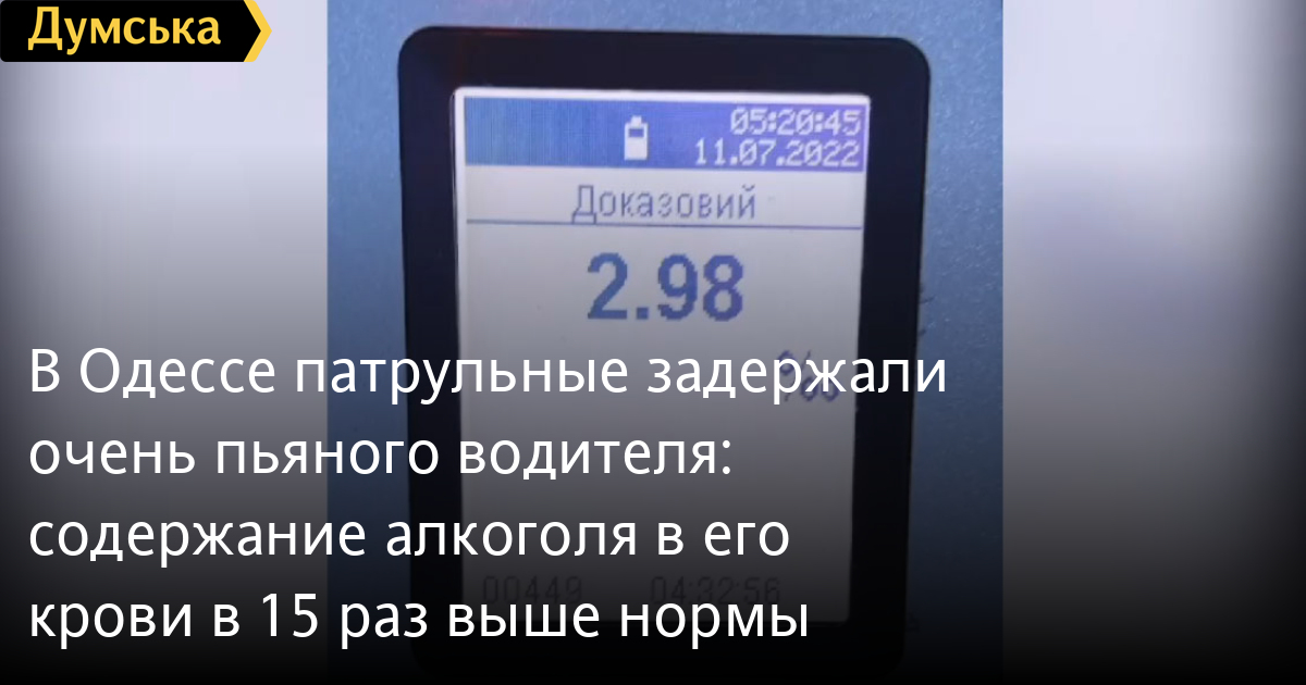 В Одессе патрульные задержали очень пьяного водителя: содержание алкоголя в его крови в 15 раз выше нормыВладелец автомобиля Cherry, которого патрульные полицейские остановили сегодня утром на улице Ильфа и Петрова, показал своеобразный антирекорд по количеству выпитого алкоголя. Как сообщает спикер патрульной полиции Одесской области Алла Марченко, содержание алкоголя в крови автомобилиста в 15 раз превышало установленную норму и составило 2,98 промилле. Всего за выходные патрульные полицейские остановили 29 любителей выпить за рулем. Кроме того, за субботу и воскресенье в отделения полиции было доставлено 27 подозрительных нарушителей комендантского часа. СМЕРТЬ РОССИЙСКИМ ОККУПАНТАМ! Заметили ошибку? Выделяйте слова с ошибкой и нажимайте control-enter Новости по этой теме: 4 августа 2025: Экспертизу не сделали, камеры не отсмотрели: одесские волонтеры жалуются на саботаж полиции в расследовании убийства собаки 29 июля 2025: В Усатово Одесской области произошла перестрелка: полиция работает на месте (видео, обновлено) 28 июля 2025: Пьяный на «Ягуаре» или гипертоник? Уволенный топ-чиновник одесской полиции хочет вернуться на службу 19 июня 2025: Девочку, которую искали сотни одесситов, нашли убитой: полиция работает с мужчиной, вероятно, причастным к гибели |
