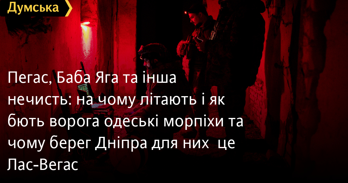 Пегас, Баба Яга та інша нечисть: на чому літають і як бють ворога одеські морпіхи та чому берег Дніпра для них — це Лас-ВегасВночі пустир десь у глушині Херсонської області за сім хвилин перетворюється на аеродром. Одесити Ахіллес, Азарт і Фенікс вивантажують антени, ноутбук, Starlink і підіймають у небо ударні дрони. Їхня робота — мінувати підходи, бити по цілях і забезпечувати своїх. «Думська» розповість про екіпаж морських піхотинців, для яких війна давно стала щоденним інженерним завданням. У КІЛЗОНІ СЕКУНДОМІР ТИКАЄ ШВИДШЕ Робота екіпажу ударних дронів починається не з ефектного зльоту, а з пилу, темряви та секундоміра в голові. У хлопців із 39-ї окремої бригади морської піхоти є рівно одна хвилина, щоб забрати обладнання з машини. У кілзоні будь-який автомобіль — це не засіб пересування, а велика, чітка мішень, яку ворог бачить у тепловізорі за кілометри. Машина має зникнути миттєво, залишивши хлопців сам на сам з їхньою технікою серед глухого пустиря. Від вивантаження до запуску Pegasus — всього 7 хвилин. За цей час на пустирі з'являється справжній пункт управління польотами. «Розгортаємо комплекс: антена для зв'язку, відео, управління, наземна станція — ноутбук. І зв'язок через Starlink для комунікації з керівництвом. Антену вночі важко знайти, а ось машину можуть зафіксувати в тепловізорі й провести до точки. Тому ми ніколи не стоїмо на місці. Або ти рухаєшся швидше, ніж противник збагне, або ти — ціль», — розповідає командир екіпажу з позивним Ахіллес. Ахіллес родом з Одеси. Свій позивний він отримав ще на початку великої війни — побратими пожартували над фрагментом із фільму «Троя», де лунало запитання «Хто ти, воїне?». На фронті з 2022 року, починав ще під Миколаєвом з маленьких цивільних коптерів, а в листопаді того ж року був серед тих, хто виганяв ворога за Дніпро. Відтоді його дім — Херсонська область. В Одесі залишилися батьки та друзі, за якими він дуже сумує. Усі троє, Ахіллес, Азарт і Фенікс — одесити-добровольці. У їхньому арсеналі важкі Vampire (та сама Баба Яга, яка лякає росіян однією назвою та звуком восьми пропелерів), Heavy Shot, Kazhan і маневрові Pegasus. Хлопці підкреслюють: вони повністю взаємозамінні й кожен може виконувати роботу іншого, від пілотування до технічного обслуговування. Звичні для них ролі: Ахіллес — командир, Азарт — пілот, Фенікс — технічна підтримка. Сьогодні пілот дрона — це найбажаніша і водночас найнебезпечніша спеціальність на фронті. Фенікс «Росіяни давно полюють на операторів дронів. У нас вуха на маківці завжди насторожі. Рація увімкнена: черговий може попередити про щось важливе. Ми завжди чекаємо на небезпеку, маємо бути дуже уважними», — каже Фенікс. Цікаво, що динаміка війни змінила престиж професій. Якщо раніше всі хотіли перейти з піхоти в оператори дронів, то зараз ситуація інша. «Свого часу не було варіантів, щоб дрон приносив воду. Раніше потрапити в піхоту — це було пекло. Усі хотіли втекти з піхоти до дроноводів. Зараз, коли росіяни почали полювання на пілотів, хлопці намагаються піти від пілотів у звичайну піхоту. Мова не про штурмовиків, звичайно. Атака дуже важка. Хлопці-штурмовики — справжні титани. Стрілецький бій найнебезпечніший і найскладніший», — пояснює Азарт. Екіпаж виходить на місії щоночі. Літають за необхідністю: мінімум 3 польоти за ніч, максимум може бути й 10. Завдання бувають найріз
