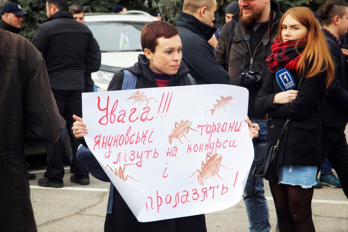 Есть вопросы у митингующих и к организации конкурса на должность первого заместителя главы ОГА. «То, что нам преподносят как конкурс, на самом деле фарс, — рассказала активист Яна Титаренко. — Все возможные процедуры были нарушены, и мы категорически отказываемся признавать, что милиционер с 20-летним стажем, будучи замечен в коррупционных скандалах, мог победить в конкурсе. Прессу и общественность на конкурс не пустили, мы вынуждены были наблюдать все на экране, где были видны разве что ноги кандидатов».