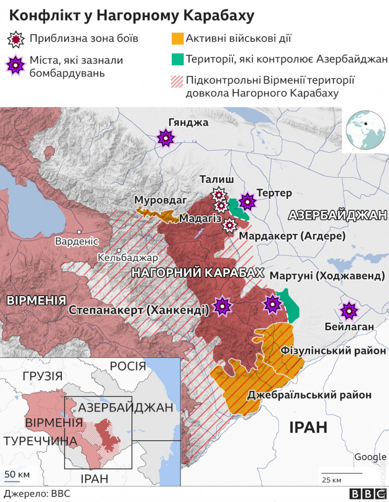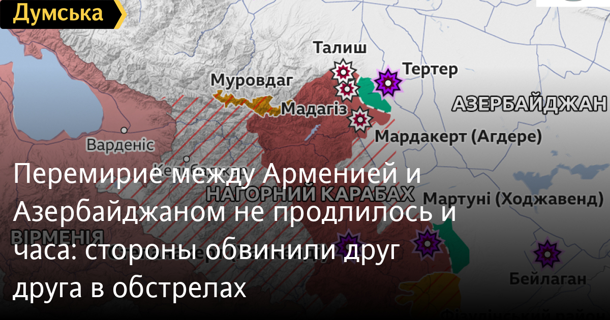 Перемирие между Арменией и Азербайджаном не продлилось и часа: стороны обвинили друг друга в обстрелахПеремирие между Баку и Ереваном, объявленное ранее в 12:00 10 октября, не продлилось и часа (полдень на Кавказе наступает раньше на час по сравнению с киевским временем). Представитель Минобороны Армении Арцрун Ованнисян обвинил Азербайджан в нарушении перемирия и нанесении удара по Ерицванку и Арцванику. В ответ Арзербайджан также обвинил Армению в обстрелах. Сначала Ованнисян сообщил, что азербайджанские военно-воздушные силы нанесли по городу Капан в Армении ракетный удар. Позже он уточнил, что по Капану ракетного удара не было, однако Азербайджан применил ударные БПЛА, обстреляв Ерицванк, а также село Арцваник Сюникской области Армении. Один человек погиб. В свою очередь, Минобороны Азербайджана опровергло информацию об обстреле Капана и позже оно заявило, что «территории Тертерского и Агдамского районов обстреливаются противником». Напоминаем, что после длительных переговоров 9 октября при посредничестве РФ Армения и Азербайджан договорились о перемирии в Нагорном Карабахе, которое должно было вступить в силу с 12:00 10 октября по местному времени (11:00 по киевскому). СМЕРТЬ РОССИЙСКИМ ОККУПАНТАМ! Заметили ошибку? Выделяйте слова с ошибкой и нажимайте control-enter |