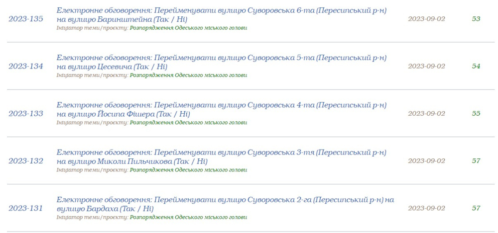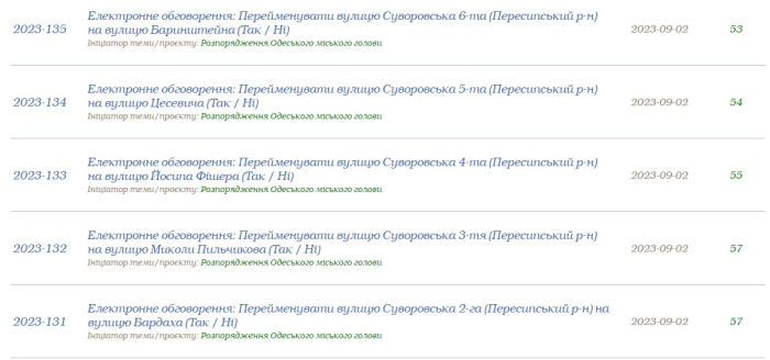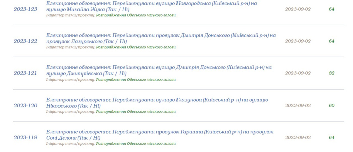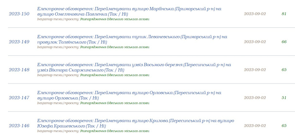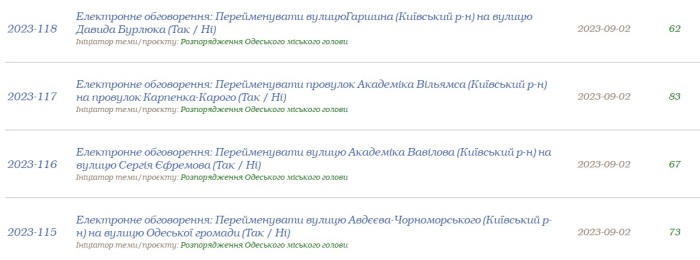 Провулок Лобановського замість Матросова і вулиця Айвазовського замість Тимірязєва: в Одесі хочуть перейменувати ще 39 топонімівЕлектронне голосування з питання перейменування 39 вулиць і провулків стартувало сьогодні в Одесі. Проголосувати можна на порталі «Соціально активний громадянин». Узяти участь може будь-яка людина, яка досягла 18-річчя й офіційно зареєстрована в Одесі. Щодо кожного з 39 об'єктів потрібно обрати відповідь «Так» / «Ні» у спеціальній формі. Голосування триватиме до 1 жовтня. Помітили помилку? Виділяйте слова з помилкою та натискайте control-enter |