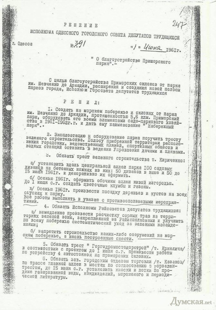 Первое упоминание о парке на одесских склонах датируется 1 июня 1961 года — именно тогда исполком Одесского горсовета принял решение «О благоустройстве приморского парка».