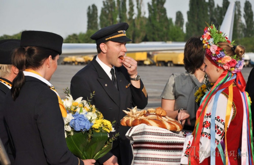 Экипаж первого самолёта, который приземлился в Одессе, сотрудники аэропорта встречали с хлебом-солью.
