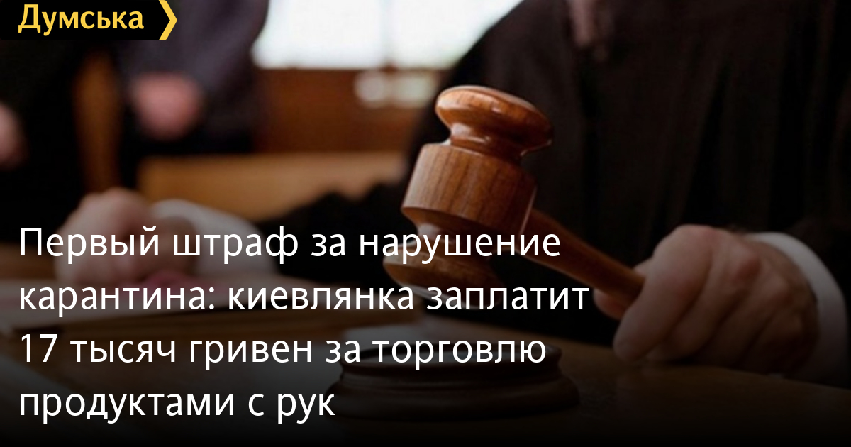 Первый штраф за нарушение карантина: киевлянка заплатит 17 тысяч гривен за торговлю продуктами с рукШевченковский районный суд столицы вынес сегодня первое решение относительно штрафа за нарушение условий карантина. Об этом сообщила пресс-служба суда. Суд установил, что жительница Киева продавала продукты питания с рук в неустановленном месте, чем допустила нарушение санитарно-эпидемиологических правил карантина. Ее признали виновной по ст. 44-3 Кодекса Украины об административных правонарушениях и обязали заплатить штраф в размере 17 тыс. гривен. В суде подчеркнули, что этот размер штрафа, согласно закону, является минимальным. Там также акцентировали внимание на том, что привлекли к ответственности женщину, которая не относится к социально незащищенным слоям населения, к пожилым людям, и которая продавала фрукты и овощи в больших количествах. Напомним, с целью борьбы с распространением коронавируса в Украине Верховная Рада приняла закон, который предусматривает высокие штрафы за нарушение условий карантина. СМЕРТЬ РОССИЙСКИМ ОККУПАНТАМ! Заметили ошибку? Выделяйте слова с ошибкой и нажимайте control-enter Новости по этой теме: 4 марта 2023: "Вакцини-довгожителі", або Як щеплення проти COVID-19 перетворилися в Україні на небезпечний ритуал 27 января 2023: МОЗ обязали опубликовать договоры на закупку вакцин против COVID-19: апелляционный суд удовлетворил иск журналиста "Думской" 11 января 2023: За неделю в Одессе зафиксировано 159 случаев ковида 4 января 2023: За неделю в Одессе зарегистрировано 113 случаев ковида |