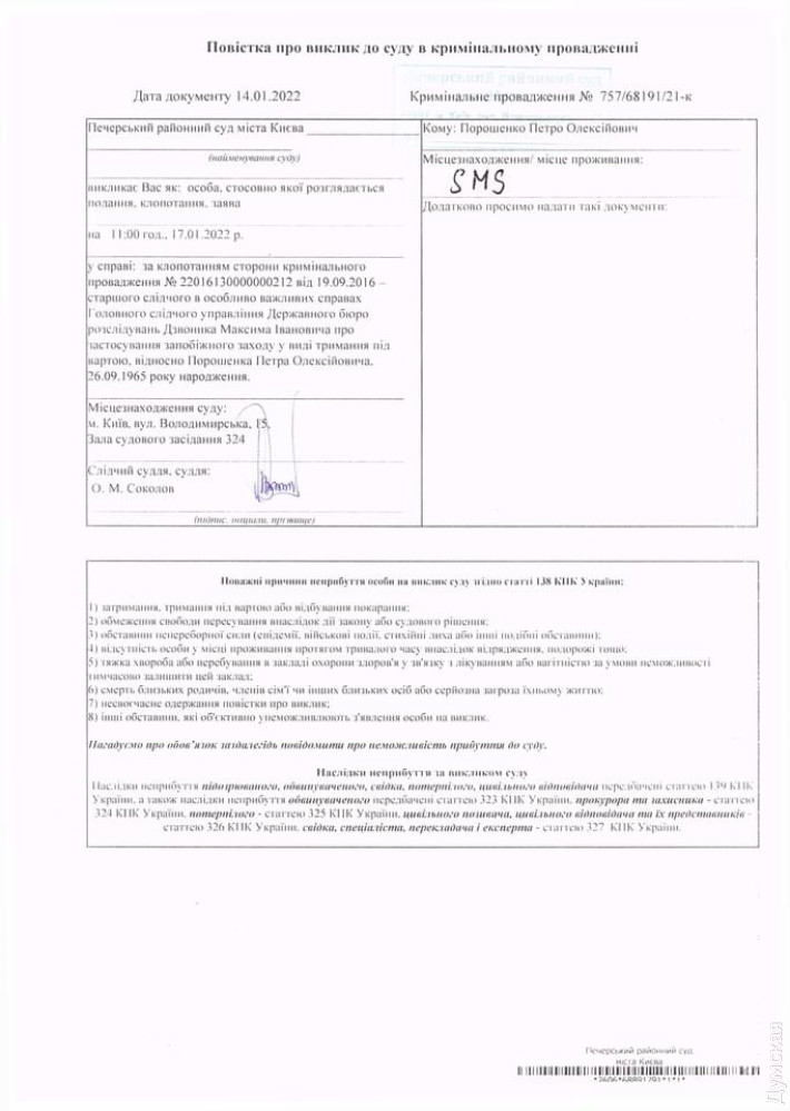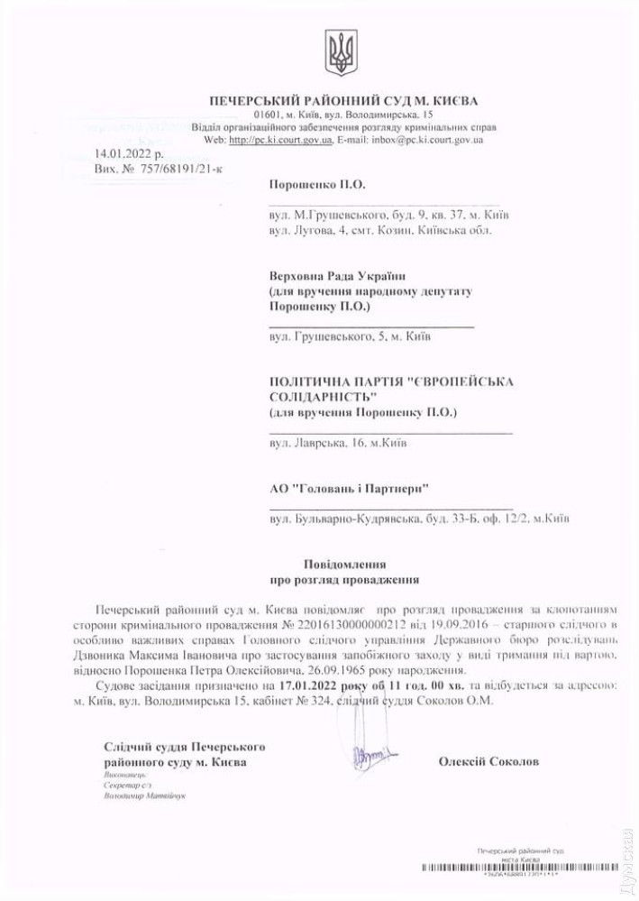 Ходатайство об избрании пятому президенту Украины Петру Порошенко меры пресечения рассмотрит Печерский районный суд Киева 17 января в 11:00.