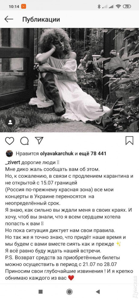 «Дорогие люди. Мне дико жаль сообщать вам об этом. Но, к сожалению, в связи с продлением карантина и не открытой с 15.07 границей. (Россия по-прежнему красная зона) все мои концерты в Украине переносятся на неопределенный срок. Я знаю, как сильно вы ждали меня в своих краях. И хочу, чтоб вы знали, что я всем сердцем хотела попасть к вам. Но пока ситуация диктует нам свои правила. Но так же я точно знаю, что придет наше время и мы будем с вами вместе сиять как и прежде. Я все равно буду ждать нашей встречи. P. S. Возврат средств за приобретенные билеты можно осуществить в период с 21.07 по 28.07. Приносим свои глубочайшие извинения! И я крепко обнимаю каждого из вас», — написала певица на своей странице в Instagram (орфография и пунктуация автора сохранены).
