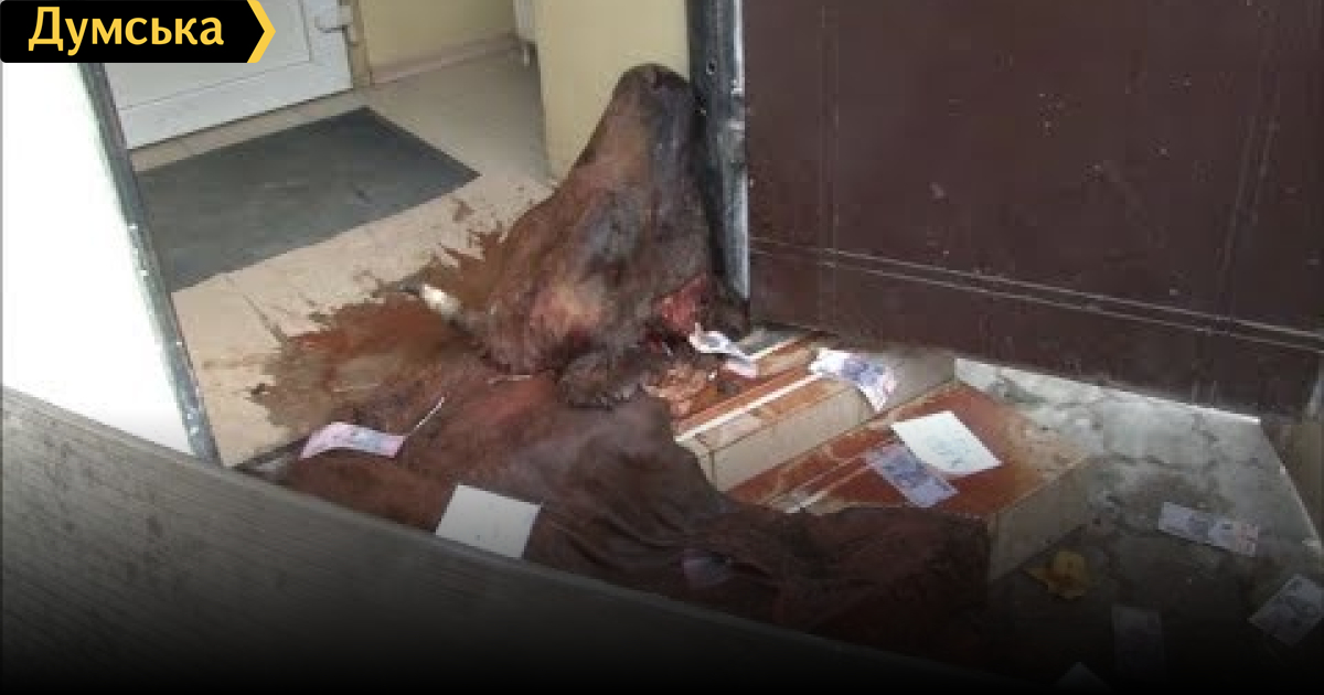 Коров'яча голова і сувенірні купюри. Незвичайну акцію-перформанс провели невідомі на вулиці Маршала Говорова. На порозі державної ветеринарної служби спочатку запалили димові шашки. Після чого кинули до дверей коров'ячі останки (шкуру, голову та копита), сувенірні купюри номіналом по 200 й 500 гривень. Також конверти з іменами співробітників ветслужби. Окремо й написали слово «хабар».