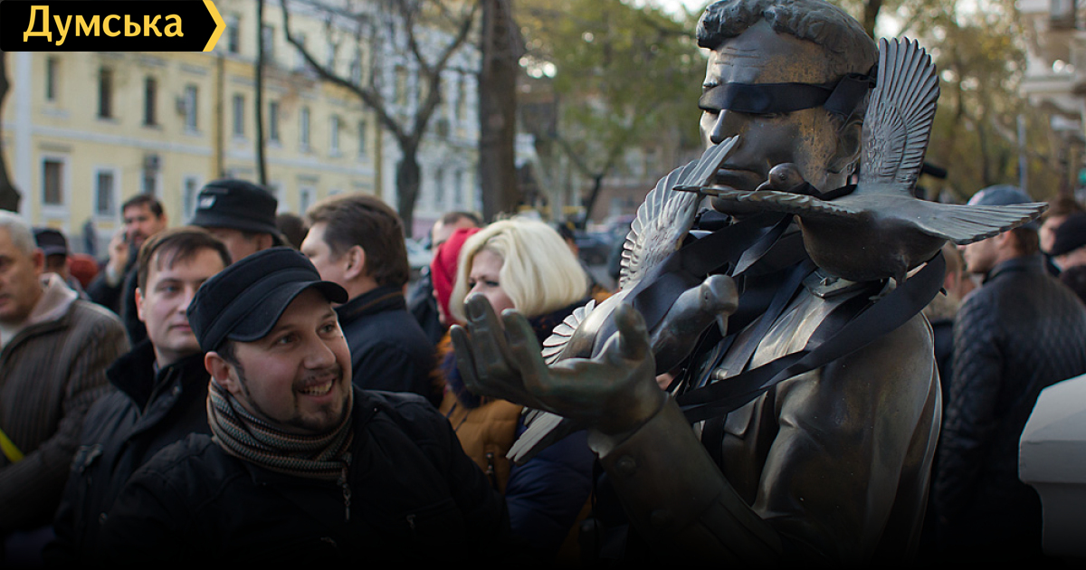Вот что не понял, зачем было на Гоцмана ленты вешать черные. Прямо таки мания по завешивания памятников всякой фигнёй. То на Дюка флаг ЕС, то сюда черные ленты. Когда уже заканчивалось, я вернулся на место митинга с другой съемки, подбил коллег и мы с помощью найденных ножниц «очистили» Гоцмана. Благо, его хоть краской не залили.
