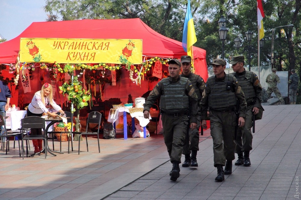 После вчерашних беспорядков мэрия внезапно решила провести на площади ярмарку национальной кухни. Отличительной особенностью мероприятия является огромное количество людей а камуфляже: представителей «Самообороны», муниципальной охраны, «Автомайдана» и других.