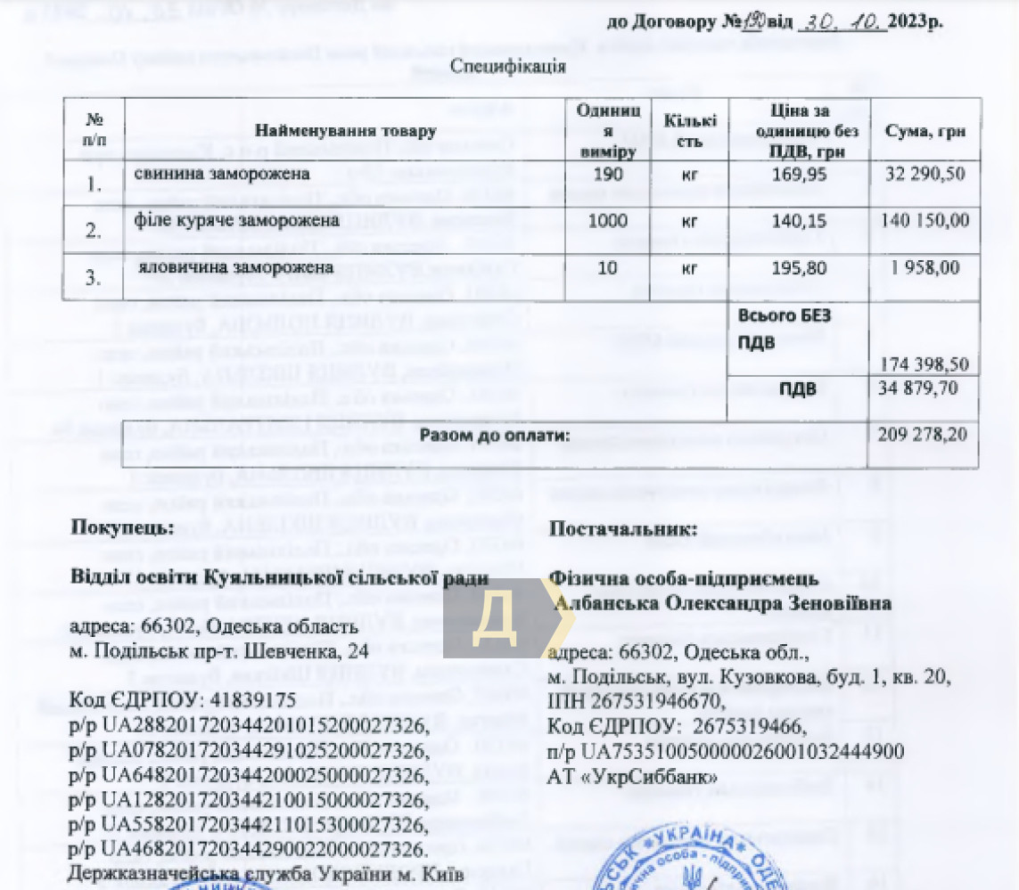 Харчовий монополіст: у місті на півночі Одеської області продукти для шкіл і садочків постачає дружина мераДружина виконувача обов'язків мера Подільська Олега Албанського у 2023 році була єдиним постачальником продуктів у всі школи та дитсадки міської громади. Фізособа-підприємець Олександра Албанська виграла всі тендери, в яких брала участь, передає кореспондент «Думської». Ваша редакція вже писала про зловживання під час закупівлі продуктів для навчальних закладів у сусідній Балтській громаді та про те, що Подільській районній військовій адміністрації варто було б звернути увагу на ці факти. Однак і в самому райцентрі ситуація доволі безрадісна. Так, у 2023 році на продукти для учнів та вихованців дошкільних закладів тут витратили понад 14 мільйонів бюджетних гривень. Нарікань на якість продуктів не виникало, проте є одна обставина — усі тендери на постачання продуктів, з яких готують їжу для учнів, виграла Олександра Албанська. Це дружина секретаря міськради, представника «Слуги народу» Олега Албанського, який з 2022 року виконує обов'язки мера. Перемоги ФОП Олександра Албанська в конкурсах виглядають, відверто кажучи, дуже натягнуто. Усі тендери були безальтернативними, до того ж допороговими, тобто угоди підписували напряму з конкретним підприємцем. Так, наприклад, за договором №133 від 10.03.2023 (щодо закупівлі охолодженого м'яса) було витрачено 1,96 млн грн; договором №627 від 14.12.2023 (щодо закупівлі охолодженого м'яса) — 0,9 млн грн; договором №47 від 7.02.2023 (щодо закупівлі сирних продуктів) — 2,88 млн грн і т.д. Утім, варто зазначити, що ціни, за якими Олександра Албанська постачала продукти до шкіл і садочків, відрізняються у вигідний бік від тих, що пропонували балтські чиновники. Взяти, приміром, куряче філе — якщо в сусідній Балтській громаді його закуповували по 215-230 гривень за кілограм, то в Подільську ціна максимально наближена до ринкової — 157 гривень за кіло. Те ж саме і з молоком (50 проти 30 гривень за 0,9 л.) та маслом (390 проти 310 грн за кг). Так чи інакше, але відсутність конкуренції при постачанні харчових продуктів в навчальні заклади, коли єдиним гравцем ринку є пряма родичка мера, виглядає вкрай підозрілою і наштовхує на нехороші думки. Зазначимо, що в радах півночі Одеської області сформувалися чи не перші альянси забороненої ОПЗЖ і «слуг народу», які остаточно оформилися в коаліцію в облраді, ініціатором якої став очільник президентської сили в регіоні та голова зборів Григорій Діденко. ОПЗЖ при цьому підтримує ініціативи «слуг», за що, очевидно, отримує бонуси. Помітили помилку? Виділяйте слова з помилкою та натискайте control-enter Новини по цій темі: 30 серпня 2025: Двісті відсотків прибутку на онкохворих: як лікарні Одеської області переплачують десятки тисяч за медичне обладнання 15 квітня 2025: Ямковий ремонт за 50 млн: в Одесі починають латати дороги, заробить і депутат-"слуга» 10 січня 2025: Тендер на організацію харчування в психлікарнях Одещини майже на 100 млн гривень виграла фірма, викрита в махінаціях 25 листопада 2024: Для відновлення зруйнованого окупантами житла: в Одеській області оголосили два найдорожчі тендери за тиждень 22 листопада 2024: В Одесі з 23 листопада перекриють узвіз Маринеско через ремонт |