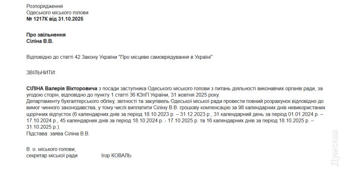 З посади заступника Одеського міського голови з питань діяльності виконавчих органів ради звільнили Валерія Сіліна. Відповідне розпорядження 31 жовтня підписав в.о. мера Ігор Коваль. Як зазначено в документі, посадовця звільнено за угодою сторін за власною заявою. Вже ексвіцемеру доручено виплатити зарплатню та грошову компенсацію за 98 календарних днів невикористаної відпустки. «Думська» зв’язалася з Валерієм Сіліним, щоб отримати коментар. З’ясувалося, що він перебуває у лікарні та обговорювати своє звільнення відмовився. Нагадаємо, Валерію Сіліну та ще вісьмом особам, серед яких колишній мер Одеси Геннадій Труханов, повідомлено про підозру про службову недбалість, в результаті якої 30 вересня загинули дев'ять осіб. 31 жовтня Печерський суд Києва постановив взяти Труханова під цілодобовий домашній арешт строком на 60 днів. Його заступникам — Анні Поздняковій та Валерію Сіліну — суд призначив нічний домашній арешт. Зазначимо, що призначення віцемера Одеси Валерій Сілін отримав восени 2023 року після відходу в Сили оборони України Олега Бриндака. Його негласним завданням був контроль за чиновницьким апаратом, виявлення нелояльних елементів і вибивання з них опозиційних настроїв. Для цього у Сіліна були всі необхідні навички, оскільки в минулому він був прокурорським слідчим-важняком. СМЕРТЬ РОСІЙСЬКИМ ОКУПАНТАМ! Помітили помилку? Виділяйте слова з помилкою та натискайте control-enter |