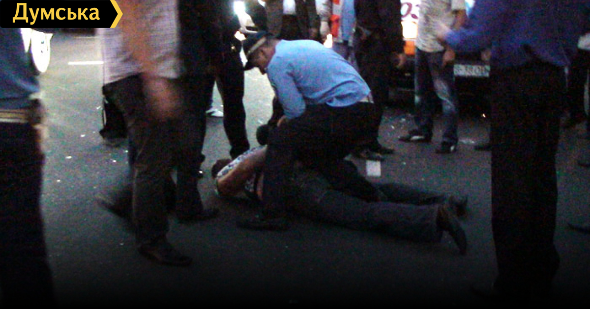 Ну якшо міліція цацкається з такими падлами, а судді за гроші відпускають їх шоби ті далі вбивали людей, то щиро вам одесити дякую за те шо не минули того козла, а хоч і не сильно, але вернули то бидло на його реальне місце — рилом в асфальт.