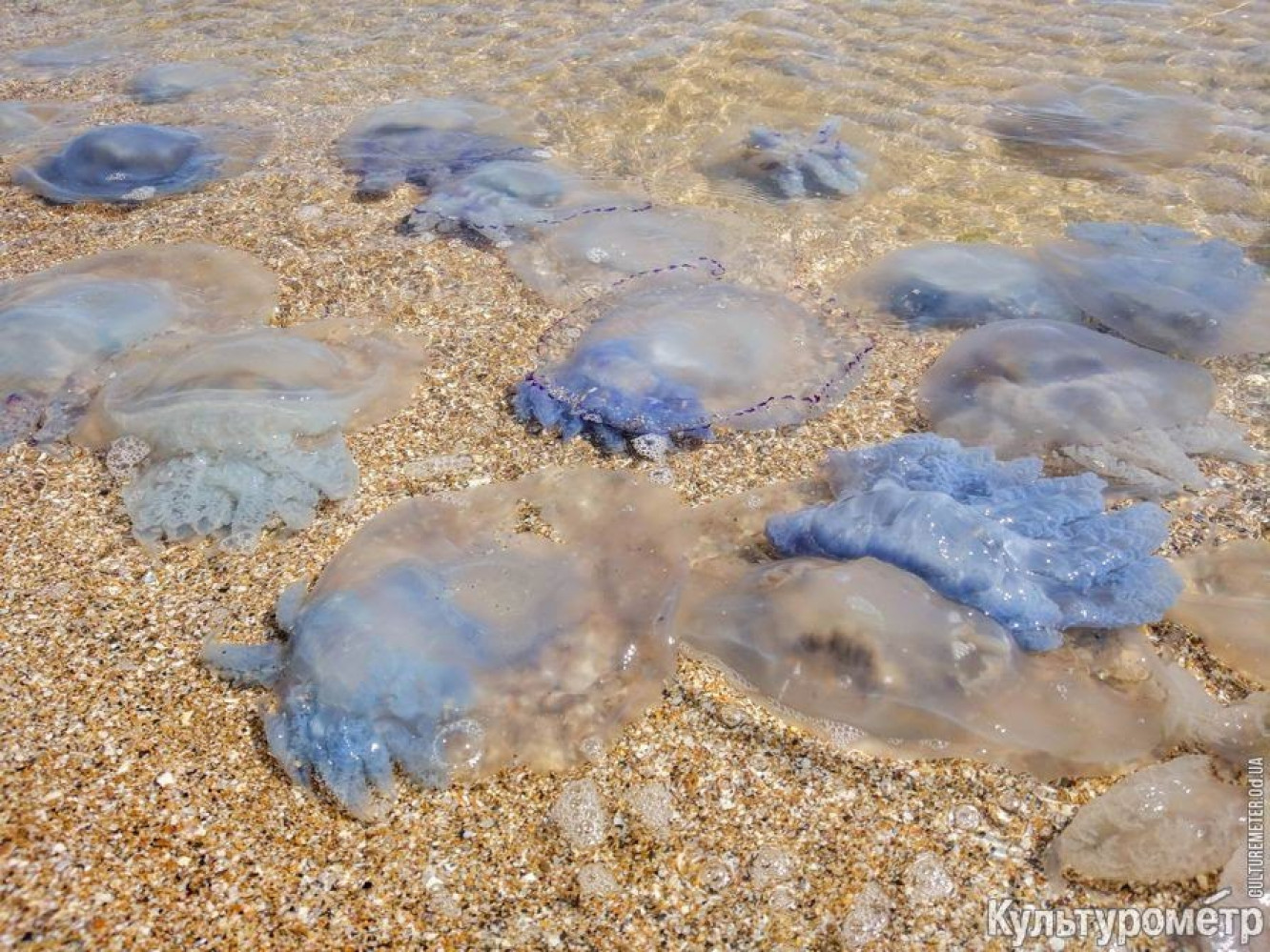 Кроме того, песок Лузановки усеян телами тысяч мертвых медуз.