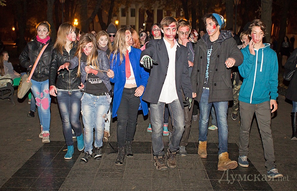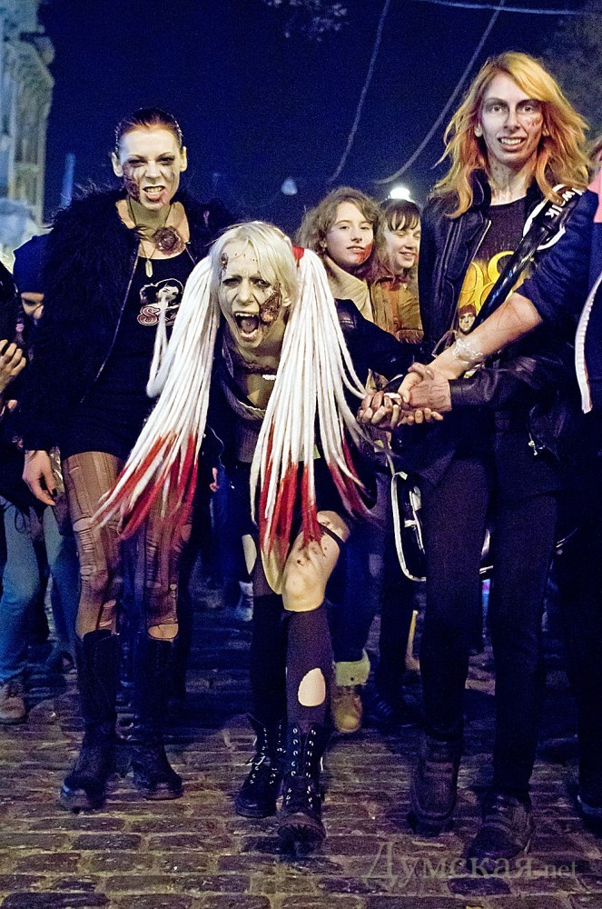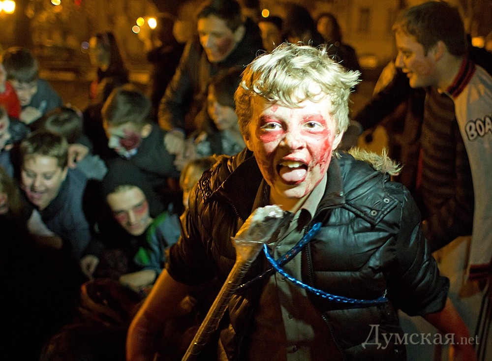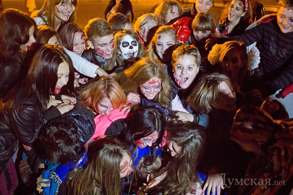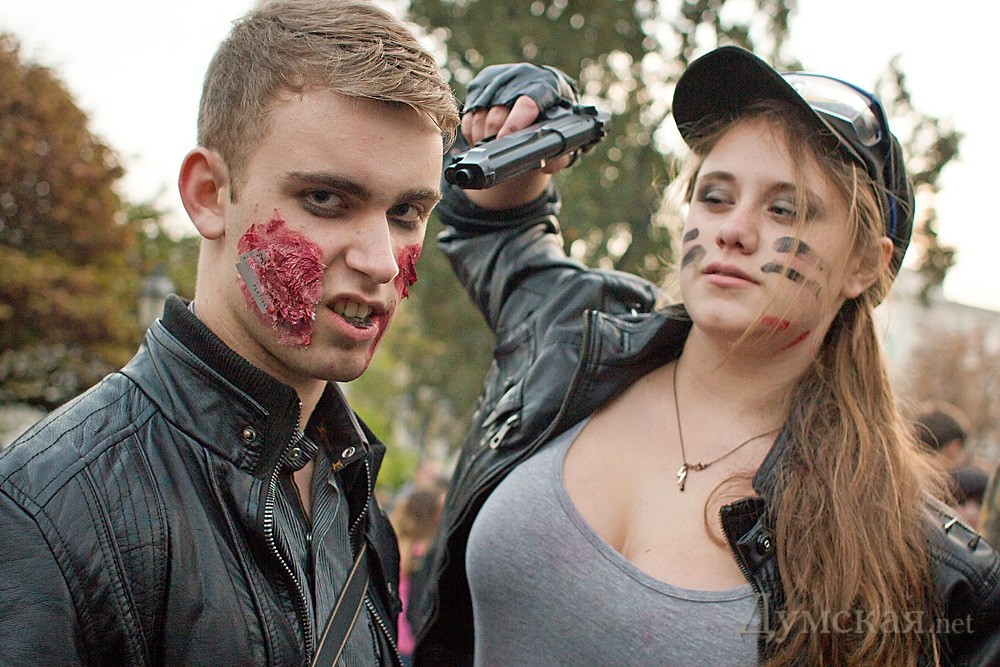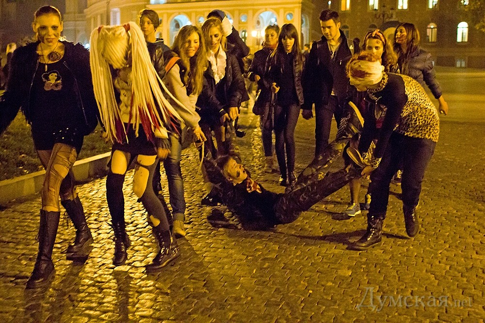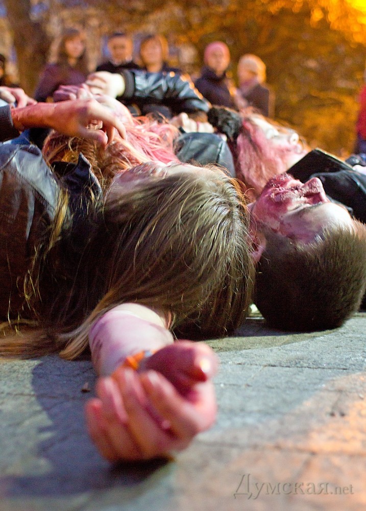В преддверии Хэллоуина, западноевропейского и североамериканского праздника, который очень полюбился жителям постсоветских республик, более ста молодых людей, загримированных под мертвецов, зомби и другую нечисть, устроили в центре Одессы парад. Восставшие мертвецы прошлись по Дерибасовской и Приморскому бульвару до памятника Дюку, где состоялось небольшое зомби-пати. В пути группу зомби, как и в прошлом году, сопровождали парни, одетые в военную форму, пытавшиеся «остановить» мертвецов. В районе Оперного театра их благополучно «съели». Причем псевдомертвецы разошлись так, что едва не раздавили одного из борцов с нечистью. После того, как толпа зомби схлынула, бедняга еще минуты две хрипел и уехал на карете скорой помощи. Как рассказал «Думской» организатор второго зомби-парада Артем Скадивалов, с каждым годом «мертвечиной» интересуется все больше народу: «Мы провели опрос в социальных сетях и получили результаты, согласно которым 70% людей в возрасте от 14 до 20 лет в душе мечтают о зомби-апокалипсисе. Подобный парад поможет им почувствовать, что это такое». Фото: Александр Гиманов СМЕРТЬ РОСІЙСЬКИМ ОКУПАНТАМ! Помітили помилку? Виділяйте слова з помилкою та натискайте control-enter |