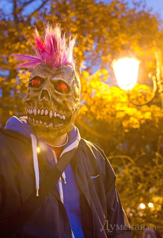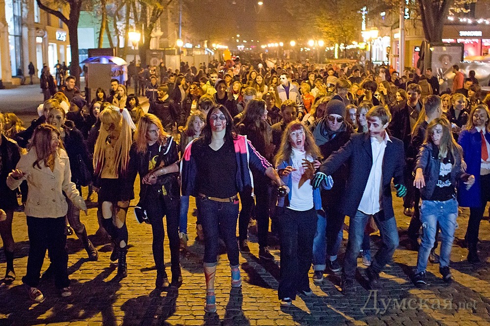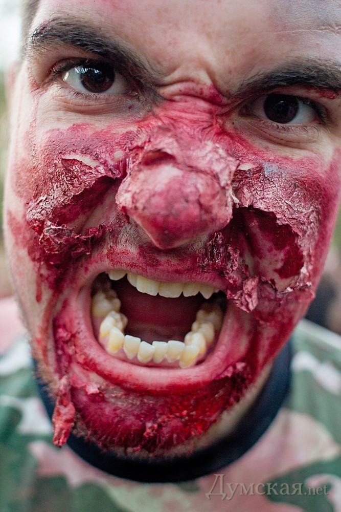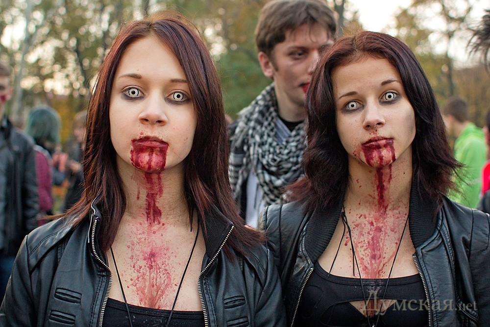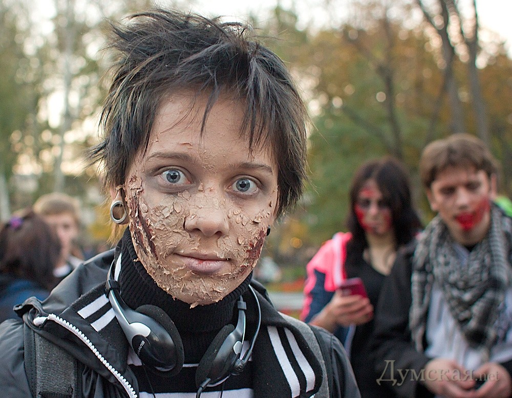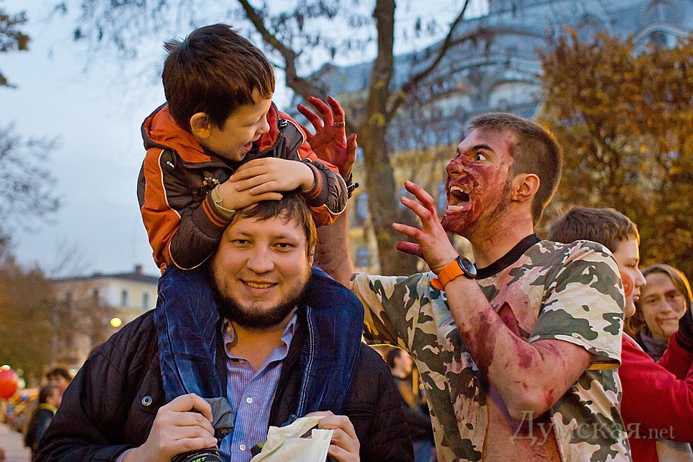 В преддверии Хэллоуина, западноевропейского и североамериканского праздника, который очень полюбился жителям постсоветских республик, более ста молодых людей, загримированных под мертвецов, зомби и другую нечисть, устроили в центре Одессы парад. Восставшие мертвецы прошлись по Дерибасовской и Приморскому бульвару до памятника Дюку, где состоялось небольшое зомби-пати. В пути группу зомби, как и в прошлом году, сопровождали парни, одетые в военную форму, пытавшиеся «остановить» мертвецов. В районе Оперного театра их благополучно «съели». Причем псевдомертвецы разошлись так, что едва не раздавили одного из борцов с нечистью. После того, как толпа зомби схлынула, бедняга еще минуты две хрипел и уехал на карете скорой помощи. Как рассказал «Думской» организатор второго зомби-парада Артем Скадивалов, с каждым годом «мертвечиной» интересуется все больше народу: «Мы провели опрос в социальных сетях и получили результаты, согласно которым 70% людей в возрасте от 14 до 20 лет в душе мечтают о зомби-апокалипсисе. Подобный парад поможет им почувствовать, что это такое». Фото: Александр Гиманов СМЕРТЬ РОСІЙСЬКИМ ОКУПАНТАМ! Помітили помилку? Виділяйте слова з помилкою та натискайте control-enter |