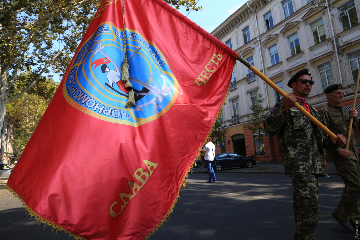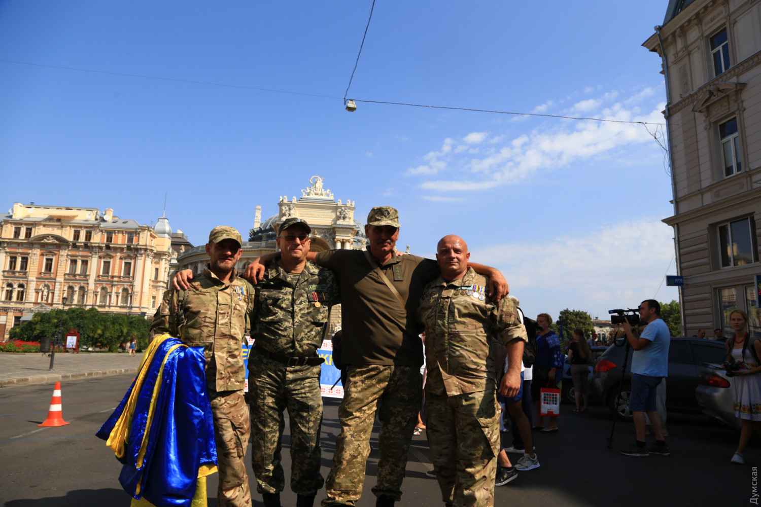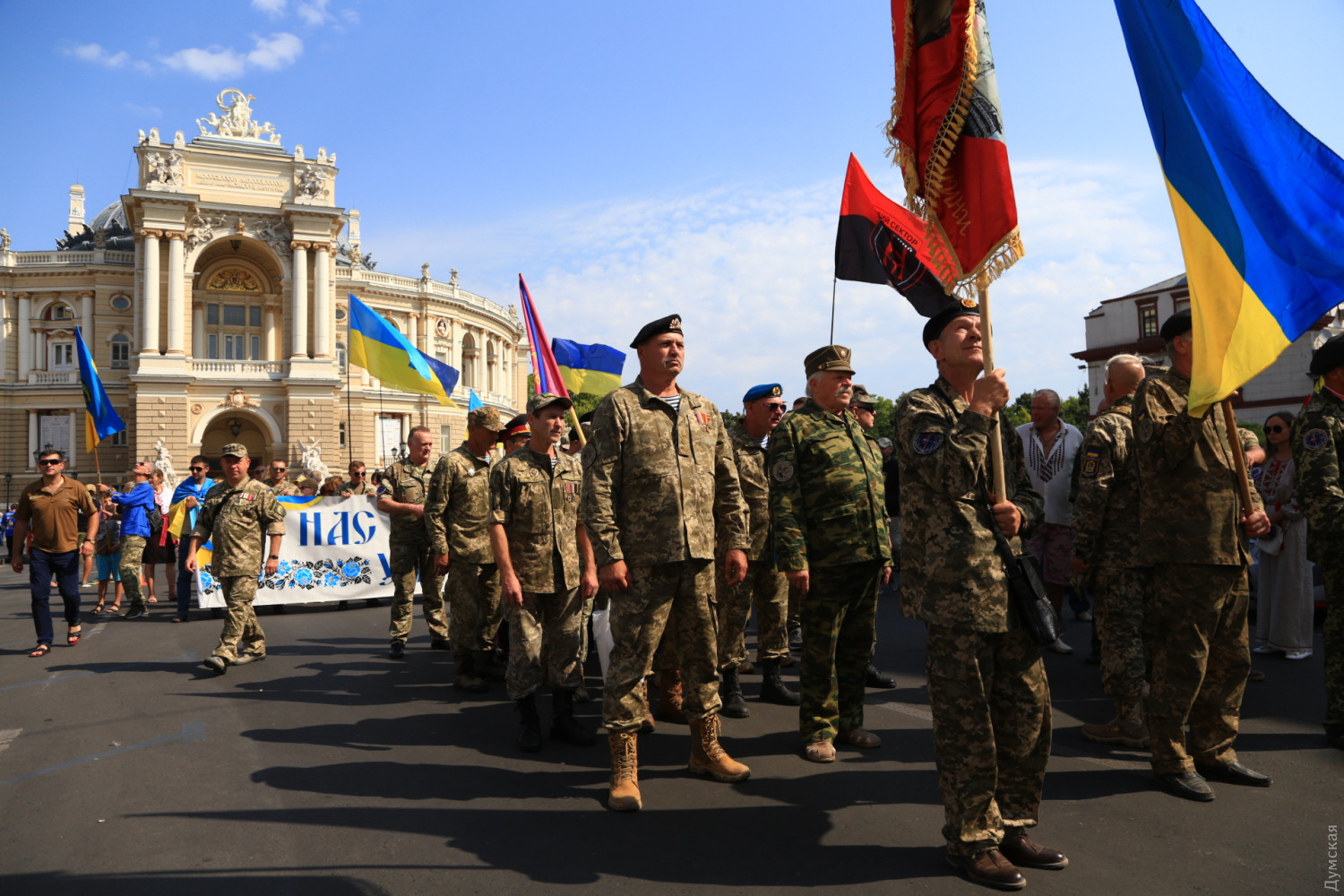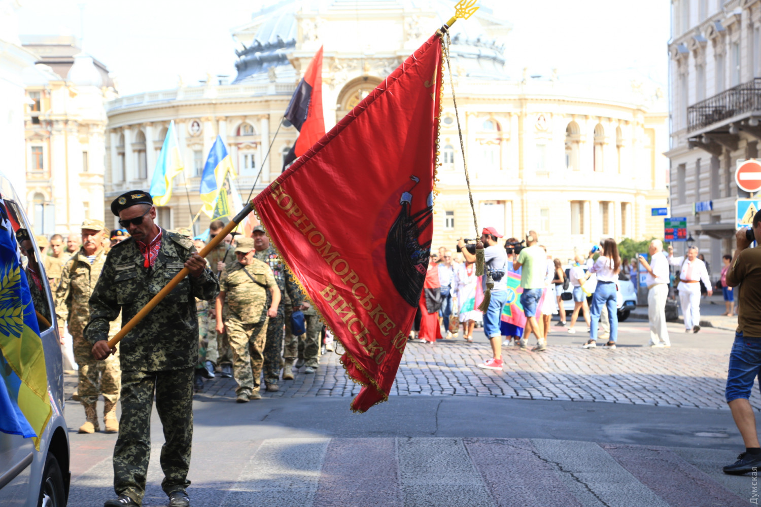 Более трех сотен представителей одесских ветеранских организаций, черноморского казачества, матерей погибших в зоне АТО и ООС и простых одесситов прошли по улице Ришельевской, Куликовому полю, завершив шествие митингом возле здания ОГА.
