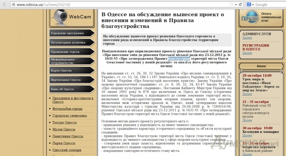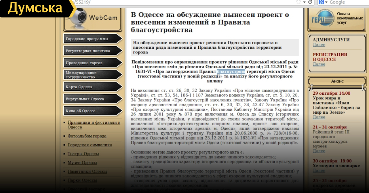 Одесситам предложили обсудить проект изменений в правила благоустройства, но документы не даютСегодня на официальном сайте Одесского горсовета появилось сообщение о том, что проект изменений в Правила благоустройства города вынесен на обсуждение. Горожанам, у которых есть замечания и предложения по этому вопросу, предлагают обращаться в управление по вопросам культурного наследия на Екатерининскую, 14. По всей видимости, изменения будут каким-то образом касаться памятников культурного наследия в центральной части города и в районе Французского бульвара. Все, кто интересуется этой темой, смогли прочитать лишь краткое маловразумительное пояснение — доступ к тексту решения и чертежам закрыт. Является ли нынешняя смешная ситуация очередной «технической ошибкой» или же эти документы должны увидеть как можно меньше людей — пока непонятно. Надеемся, что проект регуляторного акта, который повлияет на каждого одессита, все-таки опубликуют для жителей города и депутатов, которые будут за него голосовать. В любом случае, время, предусмотренное законодательством на ознакомление, уже капает. СМЕРТЬ РОСІЙСЬКИМ ОКУПАНТАМ! Помітили помилку? Виділяйте слова з помилкою та натискайте control-enter |