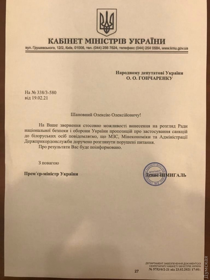 По запросу одесского нардепа Украина может ввести санкции против Лукашенко и его окруженияПремьер-министр Украины Денис Шмыгаль поручил рассмотреть вопрос о введении санкций против чиновников и бизнесменов, близких к режиму Александра Лукашенко. Об этом сообщил нардеп от «Европейской Солидарности» Алексей Гончаренко, который и подавал соответствующий запрос в Кабмин. В ответе премьера на депутатское обращение говорится о том, что он поручил рассмотреть вопрос о санкциях против Беларуси Министерству иностранных дел, Государственной пограничной службе и Минэкономики. Накануне Европейский союз на год продлил санкции против должностных лиц из Беларуси. Санкции распространяются на 88 человек, которые причастны к репрессиям, запугиванию протестующих, оппозиционных политиков и журналистов. Среди них президент Александр Лукашенко, а также семь юридических лиц, чьи активы заморожены. СМЕРТЬ РОСІЙСЬКИМ ОКУПАНТАМ! Помітили помилку? Виділяйте слова з помилкою та натискайте control-enter