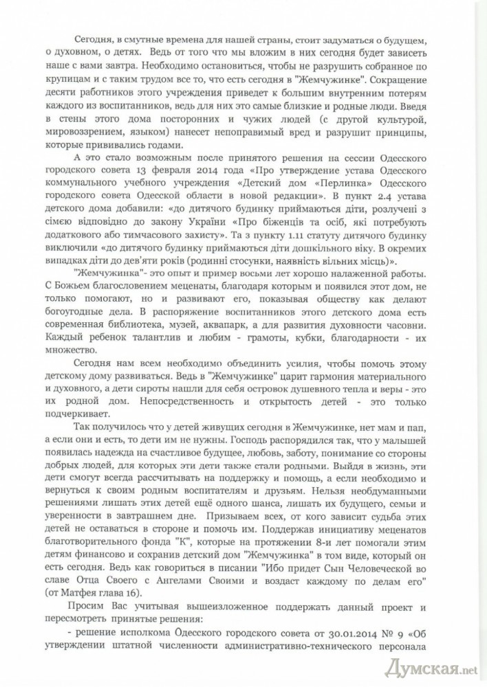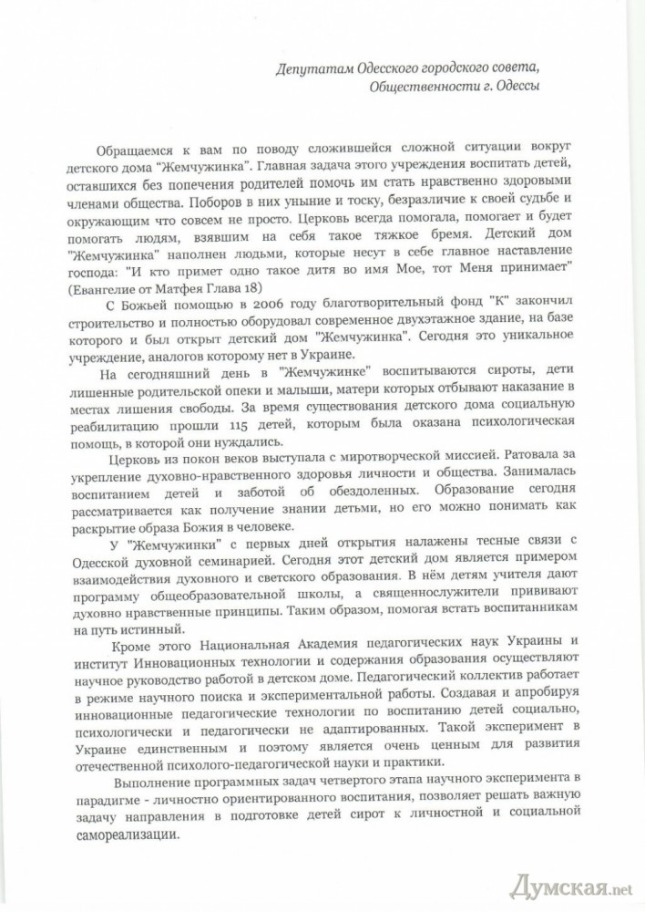 Почетные граждане Одессы вступились за детский дом «Жемчужинка» (документ)