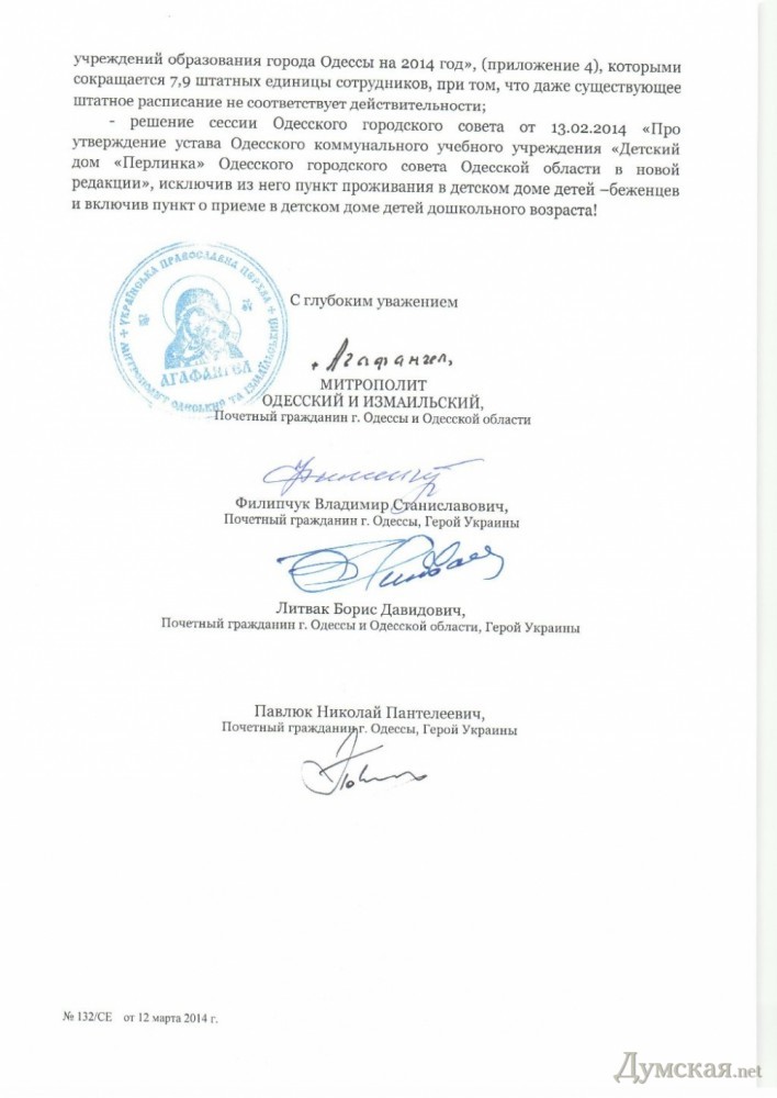 Три Героя Украины, Почетные граждане Одессы Владимир Филипчук, Борис Литвак и Николай Павлюк откликнулись на предложение митрополита Одесского и Измаильского Агафангела и подписали обращение к депутатам и общественности города. Заслуженные одесситы обеспокоены ситуацией, которая сложилась вокруг детского дома «Жемчужинка», что в районе Дачи Ковалевского.