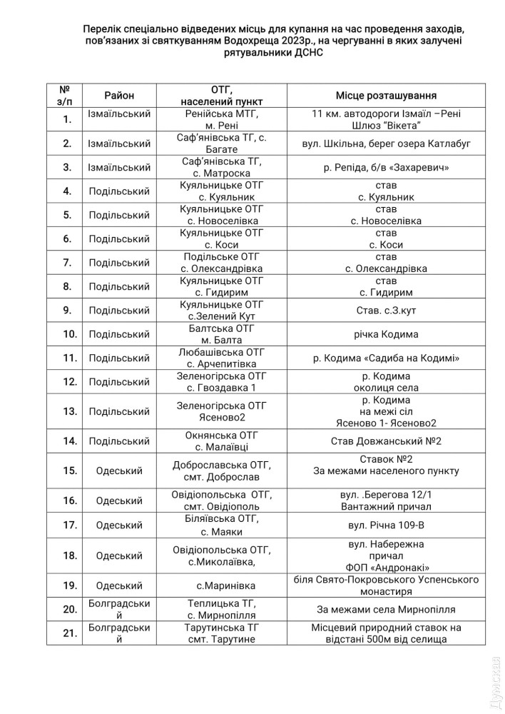 Під Одесою обладнають п`ять місць для купання на Водохреща, по області ще 16 (список)21 локацію для водохресних купань обладнають рятувальники в Одеській області. У ДСНС уточнили: місця для купань будуть тільки на території регіону, у самій Одесі їх не організують. Рятувальники нагадують усім, що безпечними для купання є тільки спеціально обладнані місця, де у свято Водохреща чергуватимуть усі відповідні екстрені служби. СМЕРТЬ РОСІЙСЬКИМ ОКУПАНТАМ! Помітили помилку? Виділяйте слова з помилкою та натискайте control-enter |