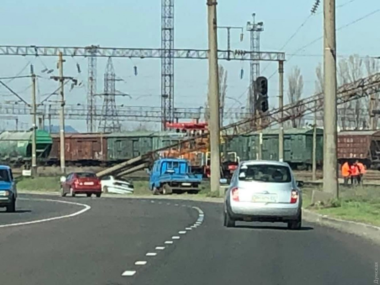 Как видно по фото, он сбил 2 электро-опоры контактной сети железной дороги.