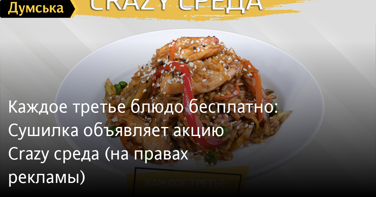 Каждое третье блюдо бесплатно: «Сушилка» объявляет акцию «Crazy среда» (на правах рекламы)Сервис доставки еды «Сушилка» вводит новую регулярную акцию «Crazy среда», в рамках которой при заказе двух товаров из категорий «Рис» и «Лапша», каждое третье блюдо идет совершенно бесплатно. В сервисе добавляют, что акция будет распространяться на рис и лапшу с меньшей стоимостью. Заказ можно сделать на сайте sushilka.od.ua или по телефонам: 073-240-0-140; 095-240-0-140; 096-240-0-140; 048-735-29-99. СМЕРТЬ РОССИЙСКИМ ОККУПАНТАМ! Заметили ошибку? Выделяйте слова с ошибкой и нажимайте control-enter |