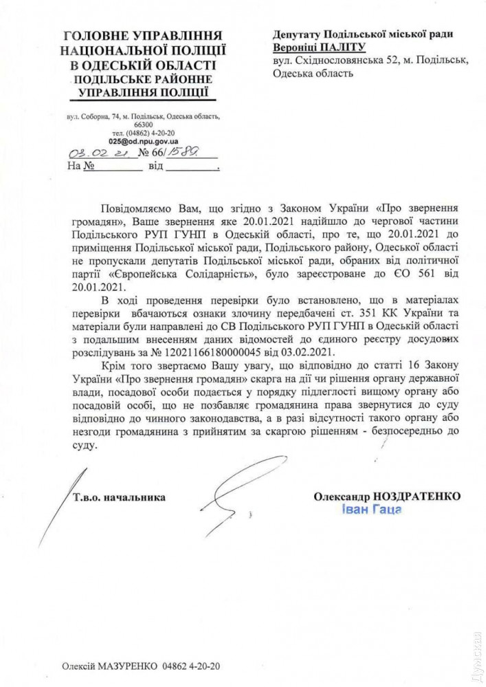 Подольская полиция выполнила решение суда и открыла уголовное производство по факту недопуска депутатов в горсовет (документ)Подольский отдел полиции Одесской области выполнил решение Киевского районного суда Одессы и открыл уголовное производство по факту недопуска депутатов Подольского горсовета от партии «Европейская Солидарность» в административное здание собрания. Об этом идет речь в уведомлении, которое полицейские прислали одному из заявителей — депутату Веронике Палиту. Суд обязал правоохранителей внести сведения в Единый реестр досудебных расследований еще 2 февраля, и на следующий день это решение было исполнено. Случившееся квалифицировали по части 1 ст. 351 УК Украины (препятствование деятельности народного депутата Украины или депутата местного совета). При этом пострадавшие узнали о начале расследования только сегодня. Напомним, инцидент, о котором идет речь, произошел 20 января. Депутаты Вероника Палиту, Наталья Янчевская и Сергей Запорожан пришли за документами в орготдел, а также по вопросам предстоящей «тарифной сессии», но охранник горсовета отказался их пропускать, сославшись на карантин. При этом депутаты от других политсил заходили в помещение беспрепятственно. Представители ЕС написали заявление в полицию, однако там его проигнорировали — в нарушение положений Уголовного процессуального кодекса Украины. Пострадавшим пришлось обжаловать бездействие правоохранителей в суде. В партии уверены, что распоряжение не пропускать в здание горсовета депутатов от «Европейской Солидарности» связано с тем, что фракция воздержалась от голосования за назначение заработной платы городскому голове Анатолию Иванову в размере 57 тысяч 500 гривен (690 тысяч гривен в год). Согласно декларации о доходах, в прошлом году Иванов в качестве заработной платы получил 561 тысячу 937 гривен. Кроме того, ему выплатили 106 тысяч 787 гривен пенсии. СМЕРТЬ РОССИЙСКИМ ОККУПАНТАМ! Заметили ошибку? Выделяйте слова с ошибкой и нажимайте control-enter |