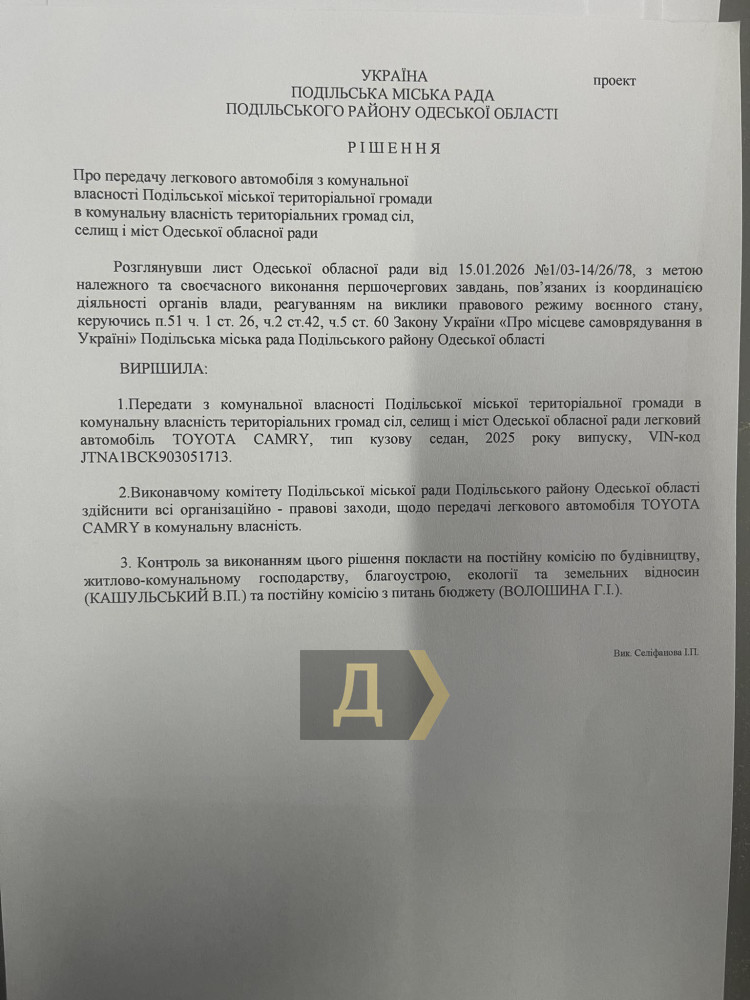 Коллекционирует Camry? Еще один элитный автомобиль Одесскому облсовету подарит Подольская громадаЛегковой автомобиль Toyota Camry, купленный за деньги жителей Подольской громады, хотят отдать Одесскому областному совету. Такой проект решения вынесли на завтрашнюю сессию горсовета, сообщил депутат от «Европейской солидарности» Олег Янчевский. Депутатам предлагают поддержать передачу иномарки «с целью должного и своевременного исполнения задач, связанных с координацией органов власти, реагированием вызовов правового режима военного времени». «Завтра городской совет Подольской громады будет продавливать депутатов, чтобы они проголосовали за передачу нового дорогостоящего автомобиля, приобретенного за средства местных жителей, Одесскому областному совету. А вы, жители, как смотрите на то, что таким образом примерно два миллиона гривен выводятся из местного бюджета? Если громада не получает очевидную пользу от передачи автомобиля, а инициатива продиктована желанием решить проблемы чиновников за счет бюджета общины, это выглядит как неправомерное расходование средств», — отметил он. Напомним, недавно японскую иномарку облсовету передала Фонтанская громада. По данным источников «Думской», происходящее в Подольске и Фонтанке — часть общей системы. В громадах избранных народом руководителей отстранили, а их места заняли секретари от «слуг». Теперь там правит альянс президентской партии и ОПЗЖ, которые послушно тратят бюджетные деньги на нужды области. Ранее Одесский областной совет, возглавляемый Григорием Диденко, уже пополнил свой автопарк шестью автомобилями Toyota на сумму более 7 млн гривен. «Думская» уже неоднократно писала, что в Одесском облсовете давно действует коалиция между «слугами народа» во главе с председателем регионального собрания Григорием Диденко, ОПЗЖ и «Батькивщиной». Они поддерживают любую инициативу пропрезидентской партии, за что, очевидно, получают бонусы. СМЕРТЬ РОССИЙСКИМ ОККУПАНТАМ! Заметили ошибку? Выделяйте слова с ошибкой и нажимайте control-enter |