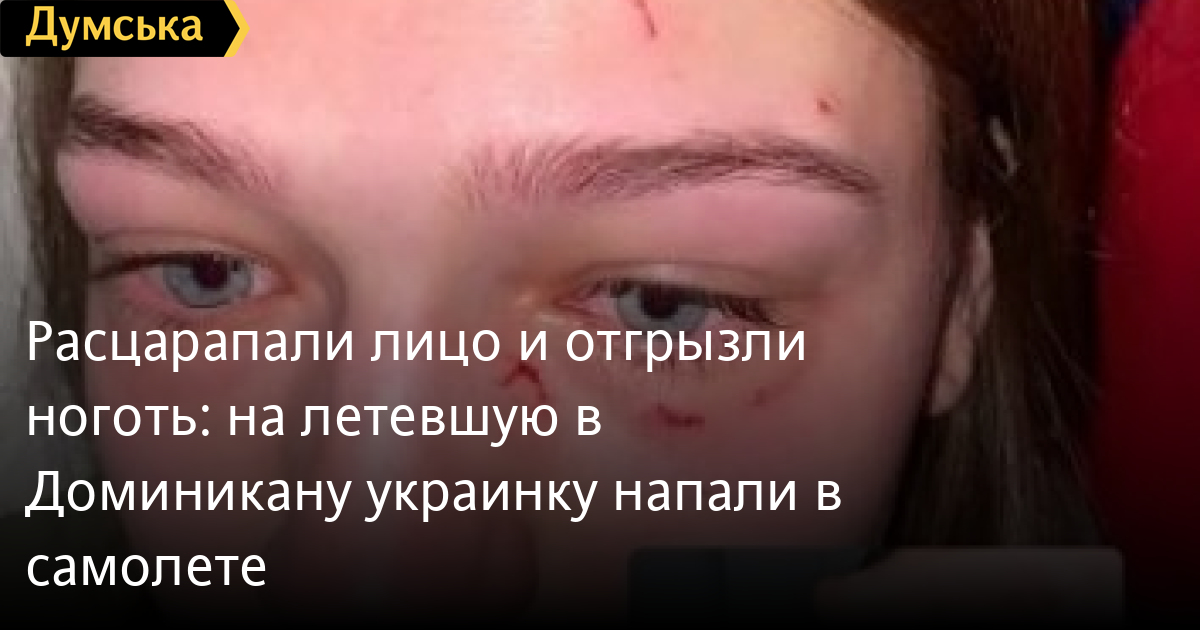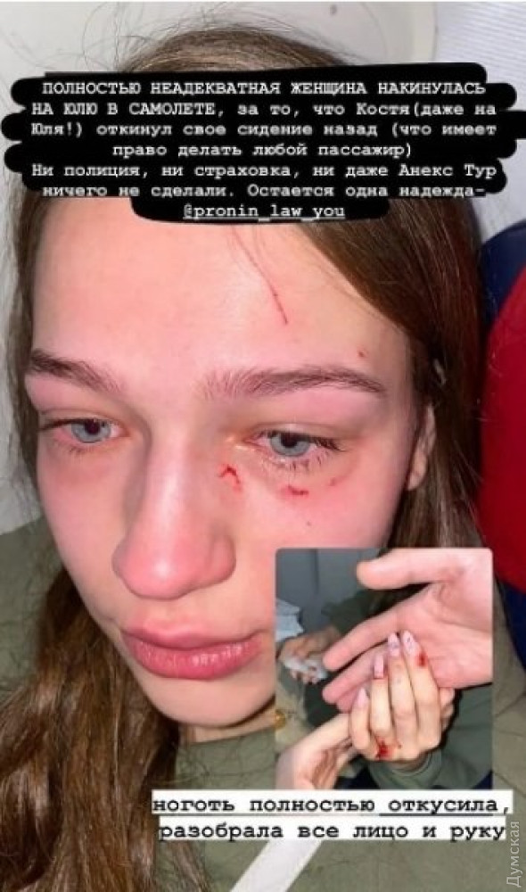 Расцарапали лицо и отгрызли ноготь: на летевшую в Доминикану украинку напали в самолетеПолет на отдых в Доминикану для украинки закончился расцарапанным лицом, травмированной рукой и откушенным ногтем. Об этом стало известно из публикации в Инстаграм блогера Андрея Трушковского. Также видео инцидента опубликовала ТСН. Как рассказал автор, на борту самолета авиакомпании Azur Air, летевшего из «Борисполя» в город Ла-Романа в Доминикане, разгорелся конфликт. Друг Андрея Константин отошел в туалет, а когда вернулся, решил откинуть спинку кресла, чтобы было удобнее. Сзади сидел ребенок, его мать на это отреагировала достаточно бурно. При этом, по словам блогера, она набросилась не на Константина, а на сидевшую рядом с ним жену Юлию, которая в этот момент, ни о чем не подозревая, спала. «Женщина начала дубасить Юлю, обзывать, потом расцарапала ей лицо, до крови покусала руку и отгрызла ноготь», — поделился Трушковский. Бортпроводники, чтобы погасить конфликт, отсадили женщину с ребенком подальше. Уже в Доминикане местные полицейские сказали, что не будут разбираться в произошедшем, посоветовали уладить это сторонам между собой. Трушковский добавил, что его пострадавшие друзья все равно намерены добиваться справедливого наказания для обидчицы. Они собираются подать в суд на женщину, напавшую на Юлию. При этом, по словам блогера, многие пассажиры, которые стали очевидцами инцидента, готовы дать показания в пользу потерпевшей. СМЕРТЬ РОССИЙСКИМ ОККУПАНТАМ! Заметили ошибку? Выделяйте слова с ошибкой и нажимайте control-enter Новости по этой теме: 12 января 2022: Харьковские станции метро ожидает масштабная проверка: в вестибюле подземки на площади Конституции рухнул потолок (фото) 8 января 2022: В Одессе из офиса фирмы выкрали сейф с внушительной суммой денег, золотом и пистолетом 27 декабря 2021: В лесополосе под Киевом нашли тело главврача из Ровенской области: по подозрению в убийстве задержаны таксист с приятелем 23 декабря 2021: В Киеве задержали подозреваемых мошенников, которые обманывали на свиданиях мужчин ради денег |