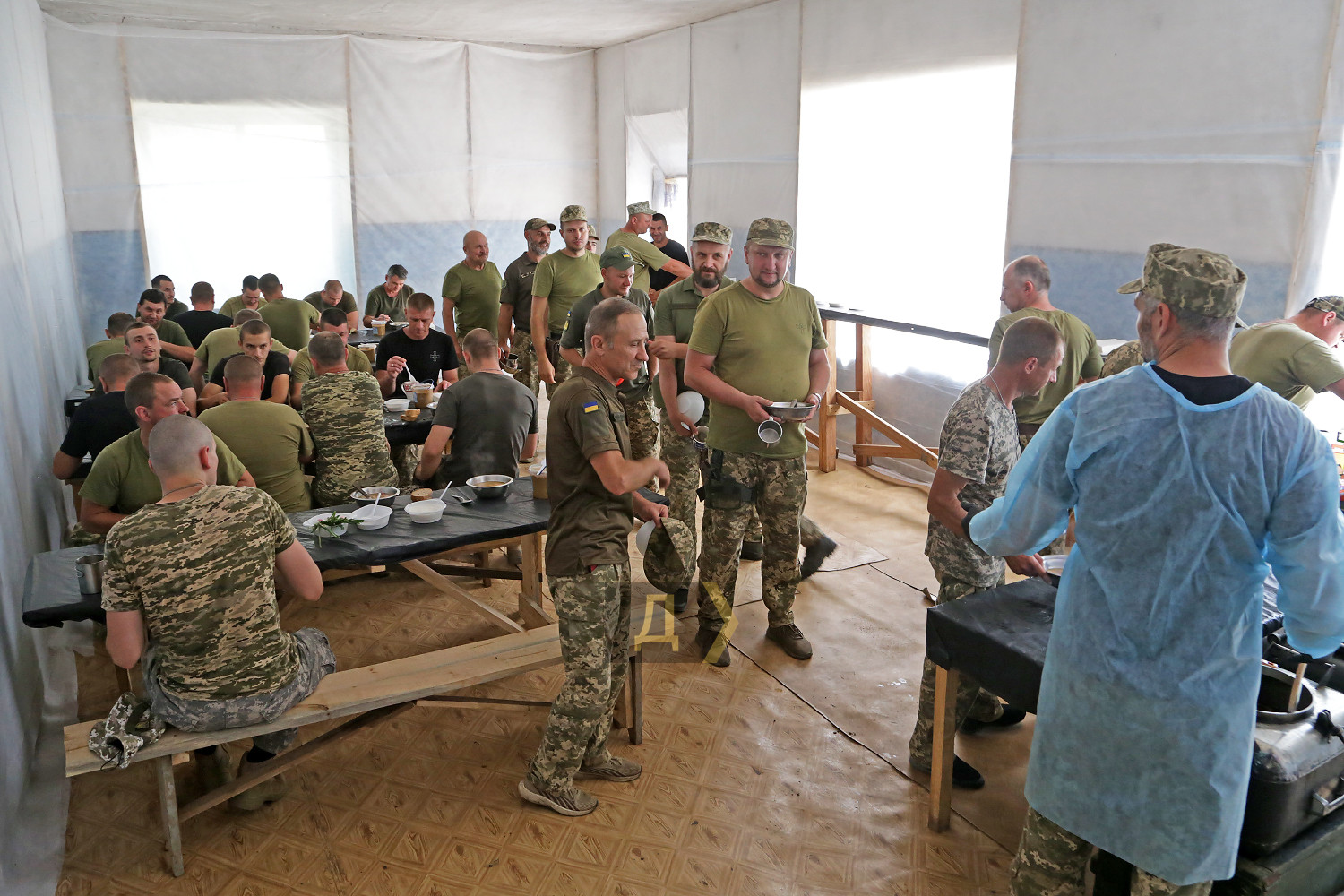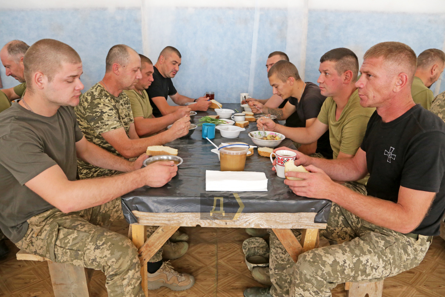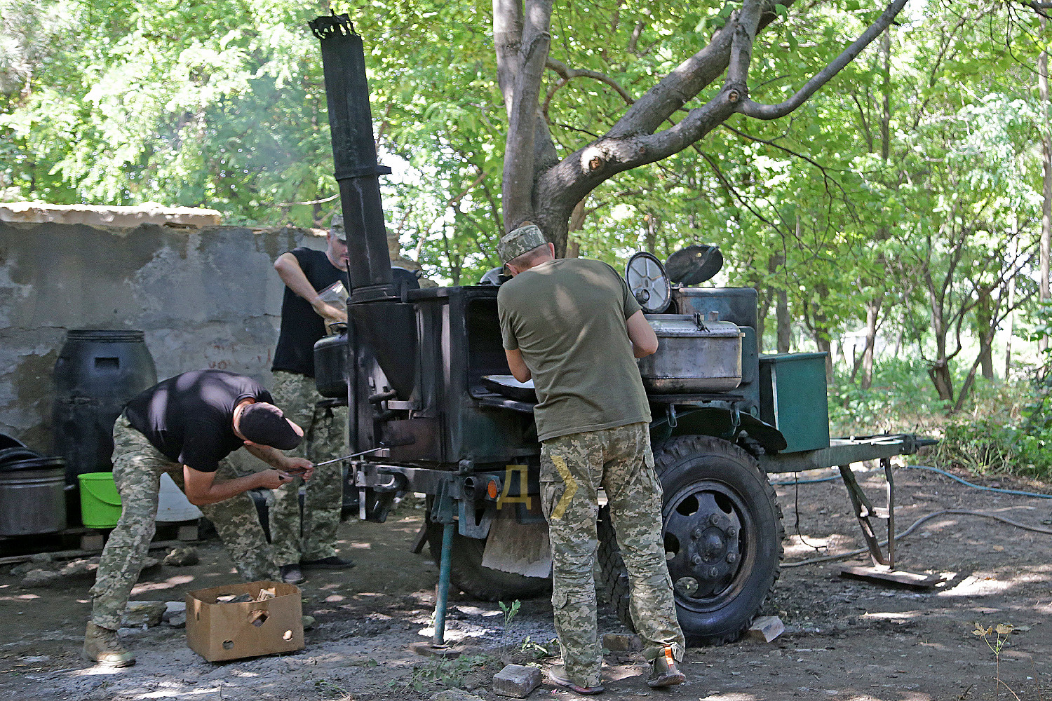 Продовольче забезпечення Сил оборони незаслужено залишається поза кадром українських ЗМІ. Ця тема вважається другорядною, чомусь її висвітлюють значно рідше бойової підготовки та власне бойових дій. Кореспондент «Думської» вирішив виправити несправедливість. Він побував у польовому розташуванні N-ської бригади морської піхоти і дізнавався, як і чим годують наших захисників. Шлях доброю дорогою туди займає близько години, але блокпости з автомобільною тягучкою значно подовжують подорож. Морпіхи розташувалися, дотримуючись усіх законів військового маскування – у непримітному місці, серед високих дерев та занедбаних господарських споруд. Незважаючи на віддаленість від міста, бійці непогано облаштували побут – тут є туалет, душові кабіни та навіть кілька пральних машин. Однак якщо форму можна випрати за допомогою сучасної електричної машини, то процес приготування їжі для цілого батальйону за останню сотню років анітрохи не змінився – ще ніхто не зміг придумати щось краще за стару добру армійську польову кухню. Але про все по порядку. Система харчування військовослужбовців, що діє сьогодні, була введена ще 2018 року і дещо вдосконалена 2020-го. Суть її насамперед у тому, що армія годує себе сама (раніше цим займалися залучені організації), за каталогом продуктів. На одного бійця виділяється фіксована сума. Сьогодні це 164 гривні на добу. Щотижневі меню складають начальники продовольчих служб підрозділів, виходячи з кількості особового складу та спираючись на каталоги, де вказано вартість продуктів. У кожному документі більше трьох сотень позицій, що дозволяє приготувати майже будь-яку страву. Меню обмежене лише польотом фантазії начпроду. Втім, тушкованих восьминогів або смажених куріпок тут вам не запропонують: польові умови – не місце для кулінарних експериментів. Хай там що, а військовослужбовець має отримувати харчування щонайменше тричі на добу — із загальною енергетичною цінністю не менш ніж 3500 кілокалорій. Вартість розподіляється приблизно так: сніданок – 35%, обід – 45%, вечеря – 20%. Конкретні умови майже завжди відрізняються від наказів та нормативних документів, але начальники продслужби намагаються витримати ці рекомендації. Насправді ж оптимальним вважається раціон, що містить 4200-4500 кілокалорій. Тижневий запас продуктів батальйон отримує щосуботи на центральному продуктовому складі ВМСУ. Тут, як у відомому оповіданні Михайла Жванецького, є все. У величезних залах із високою стелею досить холодно – за допомогою промислових кондиціонерів підтримується постійна температура 16-18 градусів. М'ясо, риба, ковбаси, сири та інші продукти, що швидко псуються, зберігають у великих холодильних камерах. В окремих приміщеннях знаходяться овочі, фрукти, крупи, кондитерські вироби, а також соки, напої (чай, кава), різні консерви, включаючи печериці та навіть маслини. Якщо рота або взвод відправляється на завдання, бійці одержують суху пайку. Зараз на складі, окрім українського, є «сухпаї» від партнерів по НАТО – данська та британська. Піддані її величності Єлизавети II назвали свій продукт «Паляниця», на честь українського слова-шиболету. Військові кажуть, що він дуже смачний і якісний, але його енергетична цінність недостатня – всього 2500 кілокалорій, тому до нього треба додавати ще щось або давати дві упаковки «паляниці» 