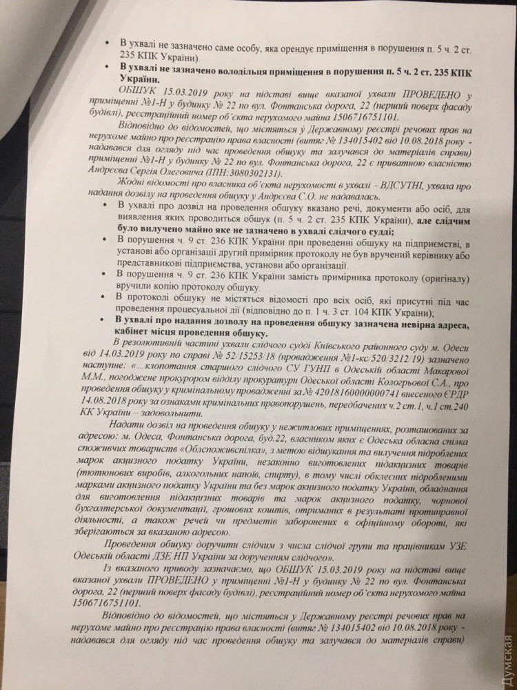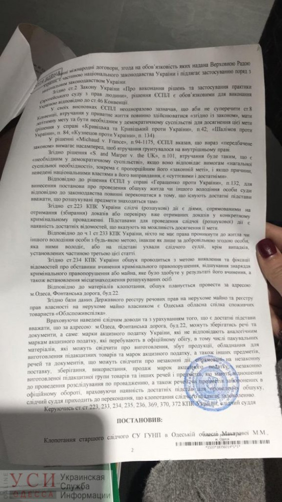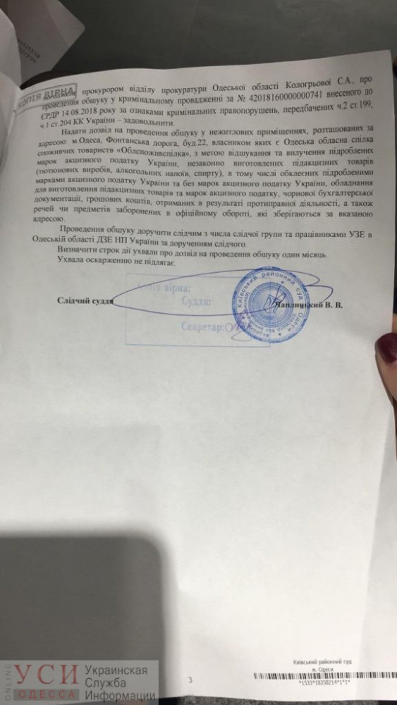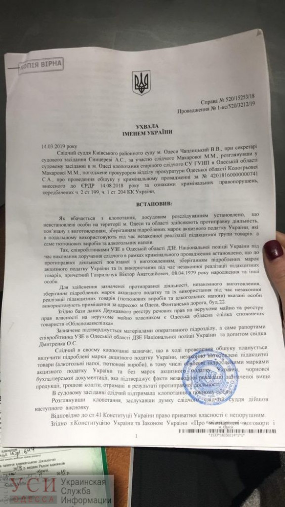 В компании сообщили, что следователи ворвались в офис якобы из-за того, что там незаконно изготавливают поддельные акцизные марки на алкоголь и сигареты, сообщает УСИ. В постановлении суда, которое предъявили сотрудникам офиса, указано, что собственником помещения является Одесская областная организация «Облпотребсоюз», но эта организация владеет помещениями совсем по другому адресу — Фонтанская дорога, 11.
