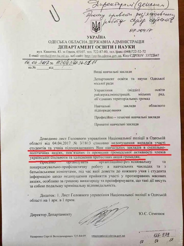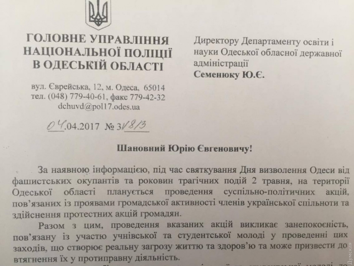 Он обнародовал письмо полицейского управления, на основании которого департамент издал свое, обратившись к руководителям учебных заведений с просьбой оказать незаконное воздействие на учащихся: «Каждый год, накануне майских праздников в Одессе, управление превентивной деятельности обращается к департаменту образования и науки ОГА с письмом, в котором просит провести профилактические мероприятия относительно участия молодежи в возможных конфликтах, которые имеют место на майские. Наверное по невнимательности, в письме департамента немного сместился акцент (на «недопущение участия в акциях гражданской активности украинцев», — Ред.). Хочу обратить внимание на то, что управление превентивной деятельности никоим образом не ограничивает права и свободы граждан», — сказал Форостяк.