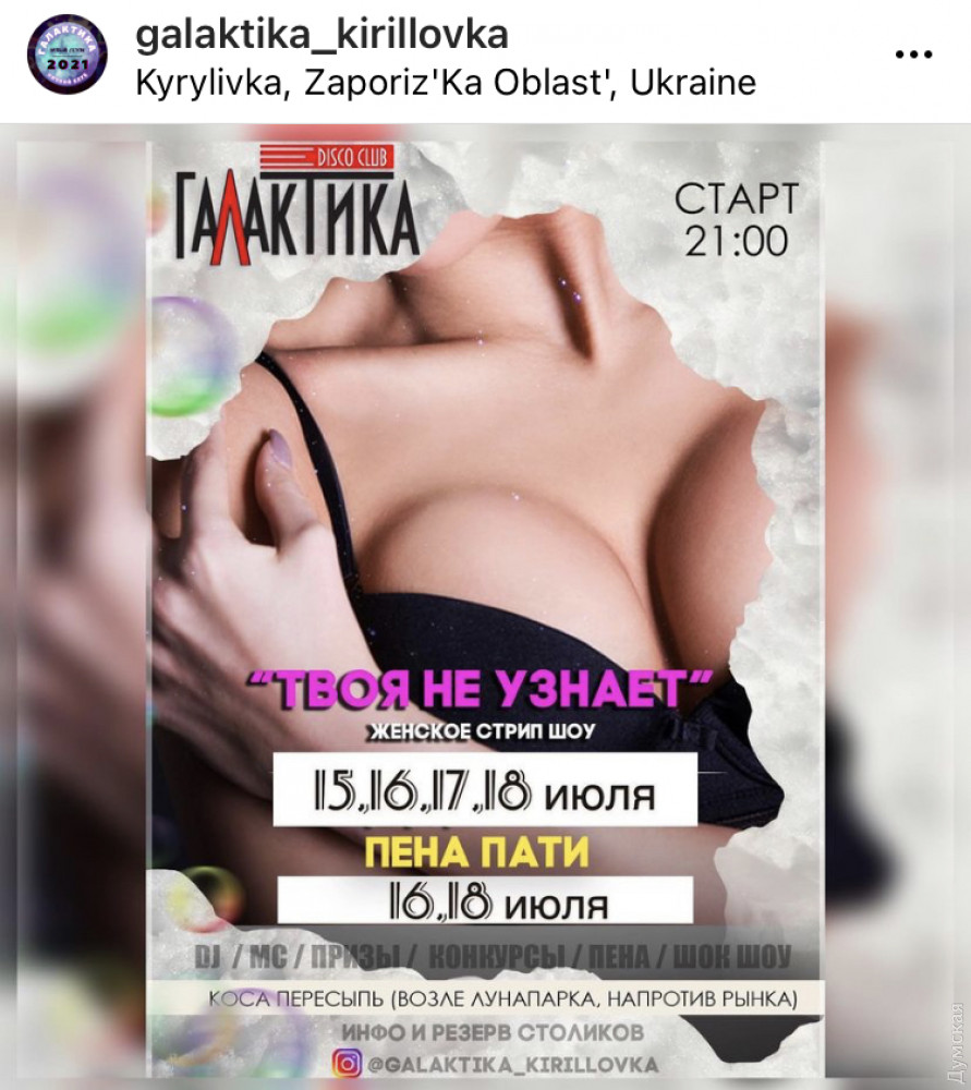 Скандальный конкурс с элементами порнографии за бутылку водки, который состоялся в ночном клубе «Галактика» курортного поселка Кирилловка, расследуют в полиции. Как сообщили ТСН в пресс-службе ГУНП в Запорожской области, о секс-оргии правоохранители узнали в ходе мониторинга новостных сайтов и соцсетей. «По состоянию на 12 августа в полицию заявлений и сообщений по этому поводу не поступало. Между тем обнародование видео вызвало неоднозначную реакцию у общественности. 12 августа информацию по этому поводу внесено в ЕРДР», — цитирует ТСН полицейских. Отмечается, что правоохранители пообщались с владельцами развлекательного заведения, ведущим, и рассказали о недопустимости нарушения норм морали и этики. Уголовное производство расследуется по ч. 1 ст. 296 УК Украины (хулиганство). Судя по всему, беседа с полицией на владельцев заведения не подействовала. На странице клуба в Инстаграме они похвастались внезапной популярностью клуба: «Пока нас обсуждают, мы делаем настоящий незабываемый вечер. Неудобно рассказать, но приятно вспомнить». Сейчас этот пост удален. В сторис появился намек, что оргия и вовсе состоялась в другом клубе. «В связи с распространением скандального ролика, вы, прежде чем оскорблять, разберитесь и доведите, что это было у нас», — заявляют в «Галактике». Вместе с тем еще недавно в клубе проходили вечеринки под говорящими названиями «Стиль собачки», «Девочкам понравится», «Твоя не узнает». СМЕРТЬ РОССИЙСКИМ ОККУПАНТАМ! Заметили ошибку? Выделяйте слова с ошибкой и нажимайте control-enter |