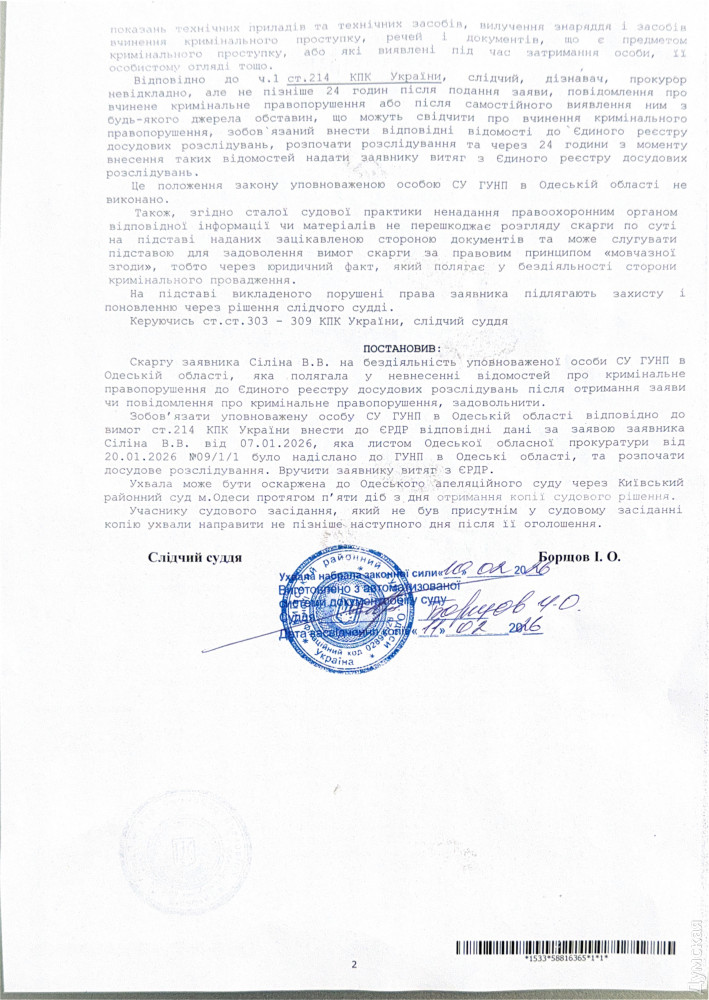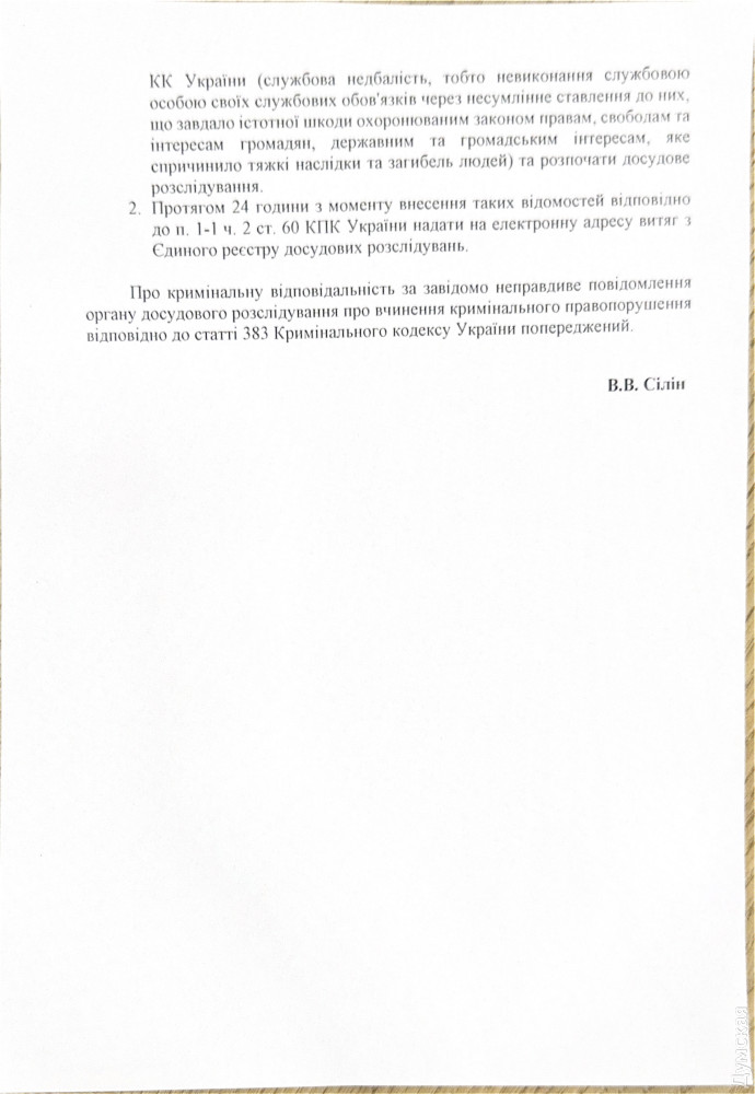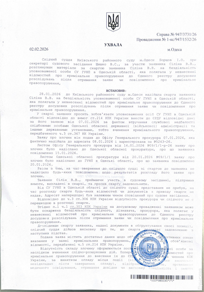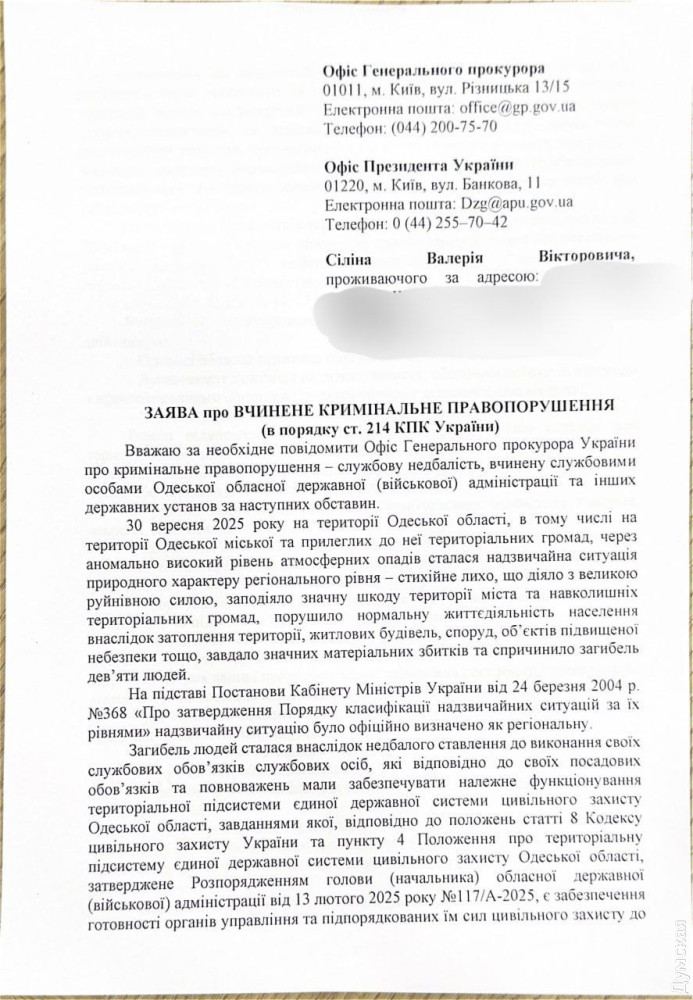 Політичне розслідування потопу: ексвіцемер вимагає перевірити роль ОВА та інших структур у трагедії в Одесі (офіційно, документи)Ексвіцемер Одеси та колишній старший слідчий в особливо важливих справах Генпрокуратури Валерій Сілін заявив про необхідність перевірити дії посадовців Одеської обласної військової адміністрації та інших структур під час потопу 30 вересня 2025 року, коли через надмірні дощі в місті загинули 9 людей. За його словами, вже наступного дня після трагедії правоохоронці визначили винними міського голову Геннадія Труханова, його заступників та співробітників міськради — без проведення повноцінних експертиз та слідчих дій. «Як можна на наступний день після події порушити кримінальне провадження і фактично визначити винних без експертиз, допитів та інших слідчих дій — я не розумію. Я знаю, як ведеться слідство і які дані повинні бути у слідчого для об’єктивної оцінки», — заявив Сілін. Він повідомив, що звернувся із заявою про можливу службову недбалість (ч. 3 ст. 367 КК України) щодо посадових осіб ОВА та інших структур. Після того як протягом місяця поліція не внесла відомості до ЄРДР, Сілін звернувся до Київського районного суду Одеси. Суд зобов’язав правоохоронців зареєструвати кримінальне провадження та почати розслідування. «Я хочу, щоб слідство об’єктивно і всесторонньо розібралося, як повинна була працювати система захисту міста, хто що повинен був робити, яка роль ОВА і міської ланки. Необхідно встановити, хто що робив, хто що не робив, хто де був і які причини цієї трагедії», — наголосив він. СМЕРТЬ РОСІЙСЬКИМ ОКУПАНТАМ! Помітили помилку? Виділяйте слова з помилкою та натискайте control-enter