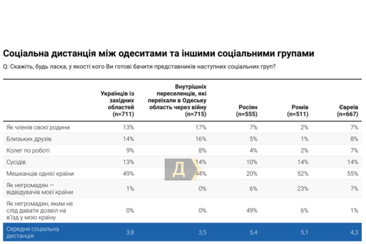 Інтерв'юйованим запропонували розповісти про своє ставлення до різних соціальних груп, зокрема: громадян росії, євреїв, ромів, мешканців західних областей України та переселенців. Щодо росіян, контраст щодо досліджень 2021 року виявився разючим. 49% респондентів вважають, що їх не можна навіть в Україну пускати. Двома роками раніше ця цифра становила 8%. Водночас 20% бачать у них жителів України. Інші цифри показують, що в регіоні є так званий «ядерний електорат», якщо застосовувати це поняття до громадян Росії. Так, 7% готові бачити їх членами своєї сім'ї — у 2021 році таких людей було 11%. Практично не змінилися показники щодо ставлення до росіян як до сусідів — 10% (зараз) проти 11% (2021 року). Другою за неприйняттям соціальною групою для одеситів є роми, хоча порівняно з дослідженнями 2021 року їхні позиції покращилися. Так, жителями однієї країни з ними згодні бути 52% респондентів (у 2021 році — 38%), не хочуть пускати в Україну 6% (у 2021 році — 34%). Однак показники, що показують імовірність близьких стосунків із ромами, ніяк не змінилися, а часом навіть погіршилися. Якщо 2021 року цей народ як членів своєї сім'ї бачило 3% опитаних, то сьогодні — 2%. Близькими друзями їх готовий бачити лише 1%, а двома роками раніше — 2%. Аналогічна ситуація і в позиції «колеги по роботі» (2% - 1%).