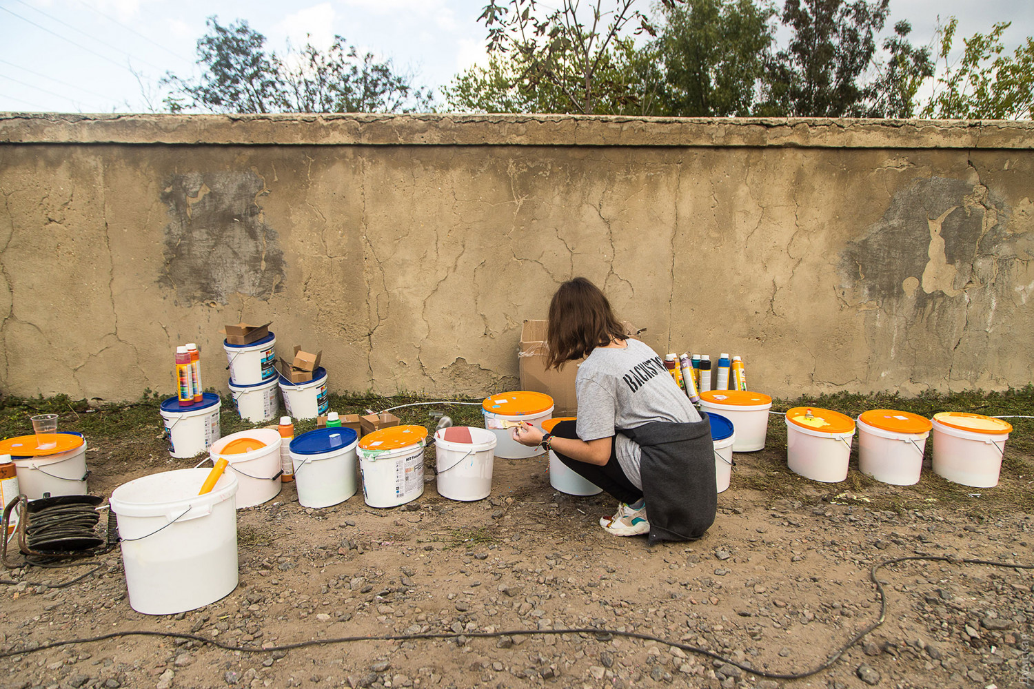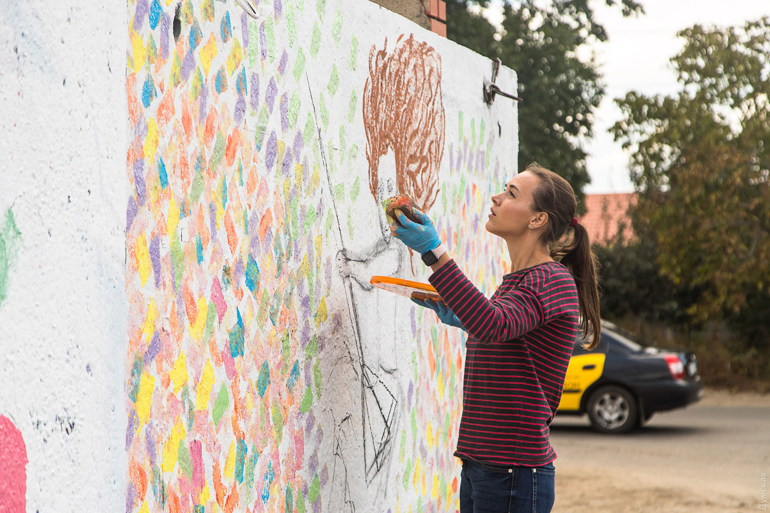 Акцию разделили на два этапа: половину стены отдали командам художников – они вольны изобразить на ней, все что считают нужным. Вторую будут разрисовывать тоже вместе, но по одному огромному эскизу, который разработали в арт-студии «Peach».