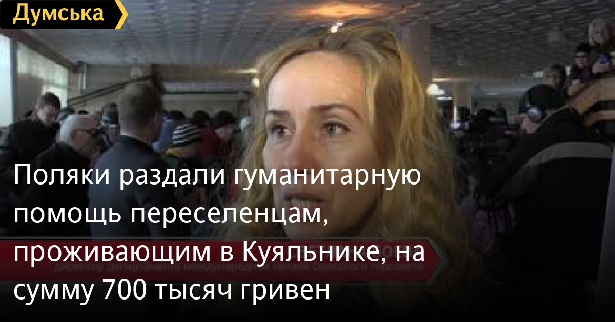 Поляки раздали гуманитарную помощь переселенцам, проживающим в «Куяльнике», на сумму 700 тысяч гривенГуманитарная помощь для переселенцев. Жители санатория «Куяльник» получили адресные подарки от представителей Генерального консульства Польши, на общую сумму более 700 тысяч гривен. Каждый из переселенцев мог составить свой список необходимых для жизни вещей, которые были доставлены за счет иностранных гостей. СМЕРТЬ РОССИЙСКИМ ОККУПАНТАМ! Заметили ошибку? Выделяйте слова с ошибкой и нажимайте control-enter Думская ТВ. Сюжеты: