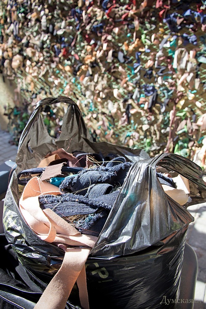 Общеизвестно, что победа куется не только на фронте, но и глубоко в тылу, где мирное население кормит, одевает и вооружает истощенную боями армию. Состояние украинского войска, в котором его застал акт братской любви одного соседнего народа, оказалось настолько запущенным, что до сих пор львиную долю обмундирования, амуниции и прочей экипировки приобретают, как говорится, всем миром, а снабжают передовую волонтеры. Немалый вклад в техническое оснащение Вооруженных сил Украины и других силовых структур страны вносят одесситы. Чего только не делают в Городе для АТО: и беспилотники собирают, и экраны противокумулятивные варят. А начиная с прошлой недели, во внутреннем дворике Музея современного искусства, что на улице Белинского, неравнодушные одесситки собственными силами плетут маскировочные сетки. Корреспондент «Думской» побывал на необычном производстве. Небольшой, но уютный дворик старинной усадьбы залит солнечным светом. Стены, окружающие дворик, украшены графитти, а стоящая в центре небольшая скамейка завалена одеждой неброских цветов. Пять девушек аккуратно разрезают ткань на равные полоски и сосредоточенно заполняют ими ячейки капроновой сети, которая растянута на газовой трубе, опоясывающей усадьбу. Свою лепту вносят и двое ребятишек. Как рассказала «Думской» одна из организаторов Юлия, идею плести маскировочные сетки для украинских военных впервые предложил активист Майдана Виталий Уманец. «Мы подхватили эту идею и уже спустя несколько дней приступили к работе, — говорит девушка. — Начинали впятером, а сейчас у нас трудятся в свободное время 25 женщин». Как оказалось, подходящие капроновые сети производят только в Одессе и Харькове. «Мы покупаем их на Староконном рынке и рассылаем по всем регионам, — рассказывает Юлия. – Такую же маскировку плетут в Киеве, Запорожье, Черкассах, Львове, Гайсине. Камуфляжные элементы создаются из любой одежды. Главное требование к ткани – неброский цвет и чтобы материал не капал при горении. Сначала мы вынесли из дома все, что могли, теперь вот закупаем в секонд-хенде. Очень помогают волонтерские организации, которые собирают помощь беженцам. У них остается много того, что не подошло беженцам». В числе прочих над созданием камуфляжного покрытия корпят модельеры-дизайнеры и несколько одесских художниц. Текстильный дизайнер и модельер Галина открывает нам секреты плетения маскировочной сети: «Сначала отрезаем небольшие лоскуты шириной 3-4 см и длиной 30-40. Эти полоски привязываются к сетке несколькими узелками, а между ними оставляют воздушную петельку, чтобы они не выползали». Когда сетка оплетена, ее красят из баллончиков в светло-серый или неброский зеленый цвета. Небольшая артель волонтеров планирует договориться с одесскими пожарными, чтобы те обрабатывали их «продукцию» специальным огнеупорным раствором. Работа не из легких. По словам Юлии, одну сетку размером десять на три метра посменно плетут 6-7 человек в течение трех дней. «После целого дня на ногах приходишь домой очень уставший, будто вагоны разгружал, но эмоциональный подъем ни с чем не сравнить. Каждый узелок мы завязываем как будто на счастье, чтобы он уберег наших мальчишек», — говорит патриотка. Между собой девушки так и называют свои творения – «оберегом». Две маскировочные сетки они уже передали бойцам 28-