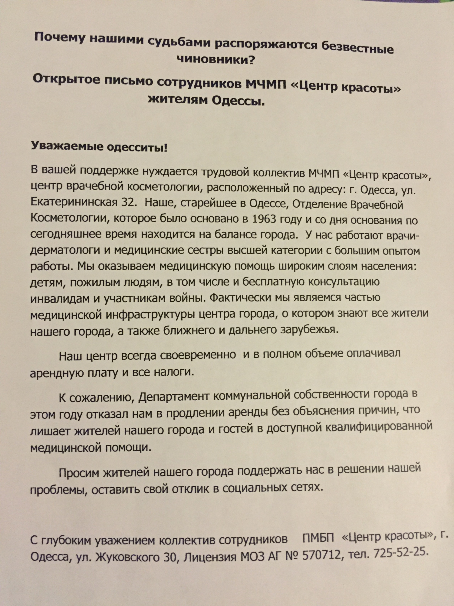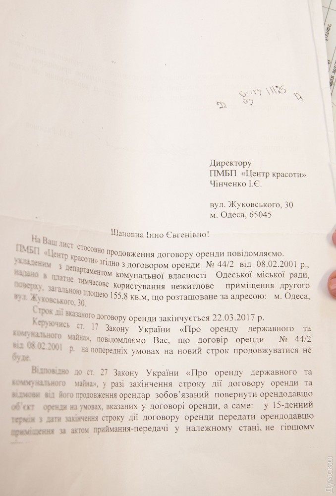 Старейшую косметологическую клинику Одессы выселяют из помещения, которое она занимает с хрущевских временСтарейшее отделение врачебной косметологии города, называющееся сейчас «Центр красоты», пытаются выгнать из помещения в доме №32 по Екатерининской. Косметологический центр, в котором работают дипломированные врачи и медсестры, был основан в середине 1963 года, когда СССР правил Хрущев, а в США еще не убили Кеннеди, и с тех пор никуда не переезжал. Но недавно муниципальный департамент коммунальной собственности отказался продлевать «Центру красоты» договор аренды. Врачей о причинах такого решения в известность не поставили. Чиновники настаивают на выселении клиники в двухнедельный срок. Как рассказала «Думской» директор медучреждения, врач-дерматовенеролог высшей категории Инна Чинченко, срок договора с мэрией истек 22 марта этого года. Документы на его продление она подала заранее, в начале марта. А потом Инну Евгеньевну вызвали в суд на рассмотрение иска мэрии о принудительном выселении. «В суде нам сказали, что основной аргумент – то, что чиновники послали письмо об отказе в продлении аренды, а мы не отреагировали. Но мы не получали никакого письма, — утверждает Чинченко. — Мы больше 50 лет проработали в этом здании, и вот так нас выкидывать — это незаконно и несправедливо. Здесь прослеживается чья-то заинтересованность в нашем помещении». Пока длятся суды, «Центр красоты» продолжает исправно платить за аренду, а это около 10 тысяч гривен ежемесячно. Суд первой инстанции удовлетворил иск мэрии и обязал косметологов освободить помещение, однако юристы «Центра красоты» в настоящее время готовят апелляцию. Косметологическое отделение Одесской хозрасчетной поликлиники №1 было одним из первых трех, созданных в Украине. В 1992 году его коллектив решил отделиться от поликлиники и заняться частной деятельностью. СМЕРТЬ РОССИЙСКИМ ОККУПАНТАМ! Заметили ошибку? Выделяйте слова с ошибкой и нажимайте control-enter |