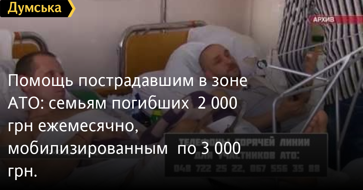 Помощь пострадавшим в зоне АТО: семьям погибших – 2 000 грн ежемесячно, мобилизированным – по 3 000 грн.