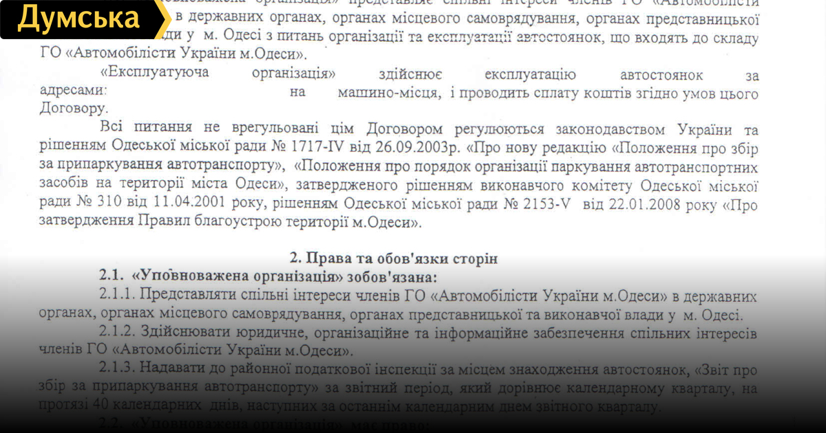 В редакцию «Думской» прислали договор организации «Автомобилисты Украины», которой руководит депутат городского совета от партии «Родина» Сергей Кушнир. Люди, приславшие договор, занимаются стоянками автомобилей в Одессе. На условиях анонимности они рассказали корреспонденту «Думской» при каких обстоятельствах к ним попал этот договор. Бизнесмены рассказывают, что договор принес к ним лично Сергей Кушнир и настойчиво рекомендовал его подписать. «Тогда вы сможете позвонить в случае проверки Парксервисом и мы вас защитим», — цитируют Кушнира предприниматели. В противном случае, говорят люди, Кушнир обещал создать проблемы и закрыть стоянку. Вице-президент общественной организации «Автомобилисты Украины Одессы и Одесской области» Александр Борисов заявил «Думской», что информация сильно искажена и не актуальна на сегодняшний день. «Действительно, подобные договоры имели место. Автомобилисты боролись с парковщиками при прошлом мэре и не хотели заключать договор с «Парксервисом», хотя многие были не против отчислять деньги в городской бюджет. Когда происходили рейдерские захваты автостоянок, мы объединились в общественную организацию. Туда вошло 27 субъектов — 103 автостоянки. Каждый субъект перечислял самостоятельно деньги в бюджет, при этом внося в название своей стоянки название организации. Когда власти стали действовать через суды и налоговые, и спрашивали, «на каком основании вы перечисляете деньги», мы придумали этот договор , - рассказал «Думской» вице-президент Александр Борисов, — Все делалось исключительно на добровольной основе. Что же касается «создания проблем» тем, кто не заключит договор — это полная чушь. Хотя были стоянки, которые вообще отказывались перечислять деньги в бюджет ни напрямую, ни окольными путями. Владельцев таких стоянок, конечно, предупреждали, что если они не одумаются, то город запретит им осуществлять подобную деятельность». В заключение наш собеседник отметил, что документ недействителен еще и потому, что организации, которая прописана в бумаге, давно не существует. «Еще при Гурвице мы поменяли название на «Автомобилисты Украины Одессы и Одесской области», — заявил Александр Борисов. СМЕРТЬ РОСІЙСЬКИМ ОКУПАНТАМ! Помітили помилку? Виділяйте слова з помилкою та натискайте control-enter