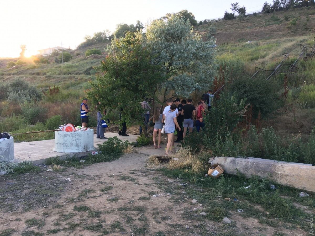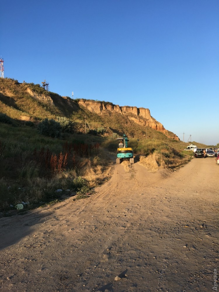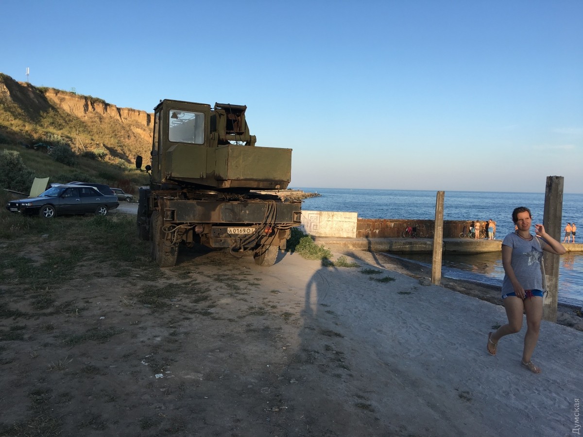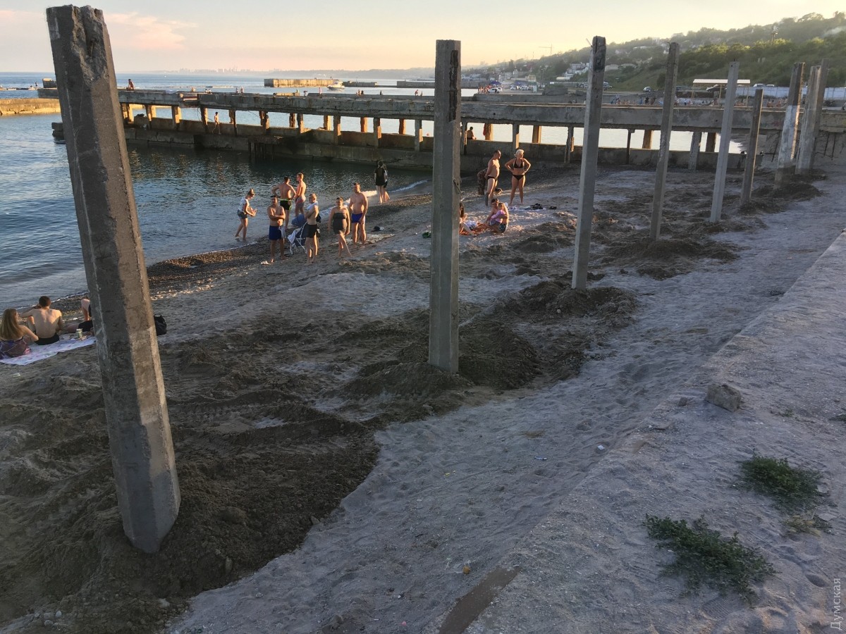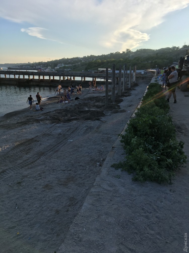 Данный участок пляжа, слева от двухэтажного пирса, пользуется популярностью среди отдыхающих. По словам очевидцев, строительная техника ездит по песку прямо среди людей. Одесситы, подозревающие, что пляж незаконно застраивают, вызвали на место полицию.