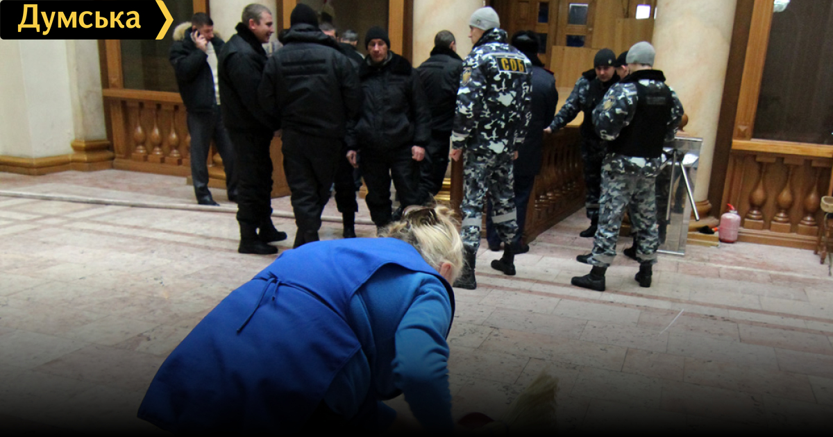 «Группа боевиков под флагами ВО «Свобода» ворвалась в зал, повредила коммунальное имущество. Штурмующие здание молодчики, вооруженные холодными оружием, использовали слезоточивый газ и вступили в драку с охраной городского совета. Защитники мэрии не допустили хулиганствующих молодчиков в здание городского совета и не дали им сорвать голосование по многим важнейшим вопросам».