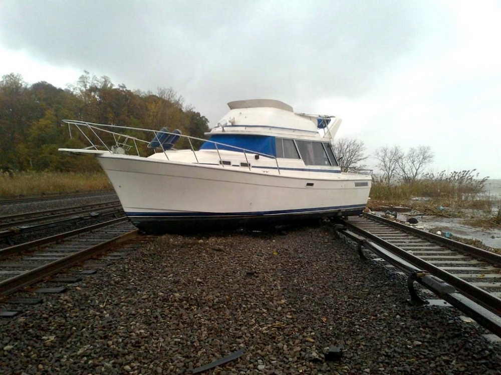 Выброшенная на железнодорожные пути яхта, Оссининг, штат Нью-Йорк, США. (AP Photo/Metropolitan Transportation Authority of the State of New York)