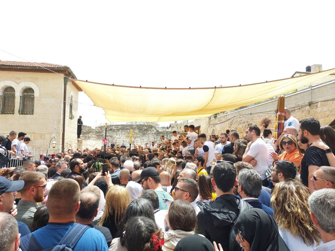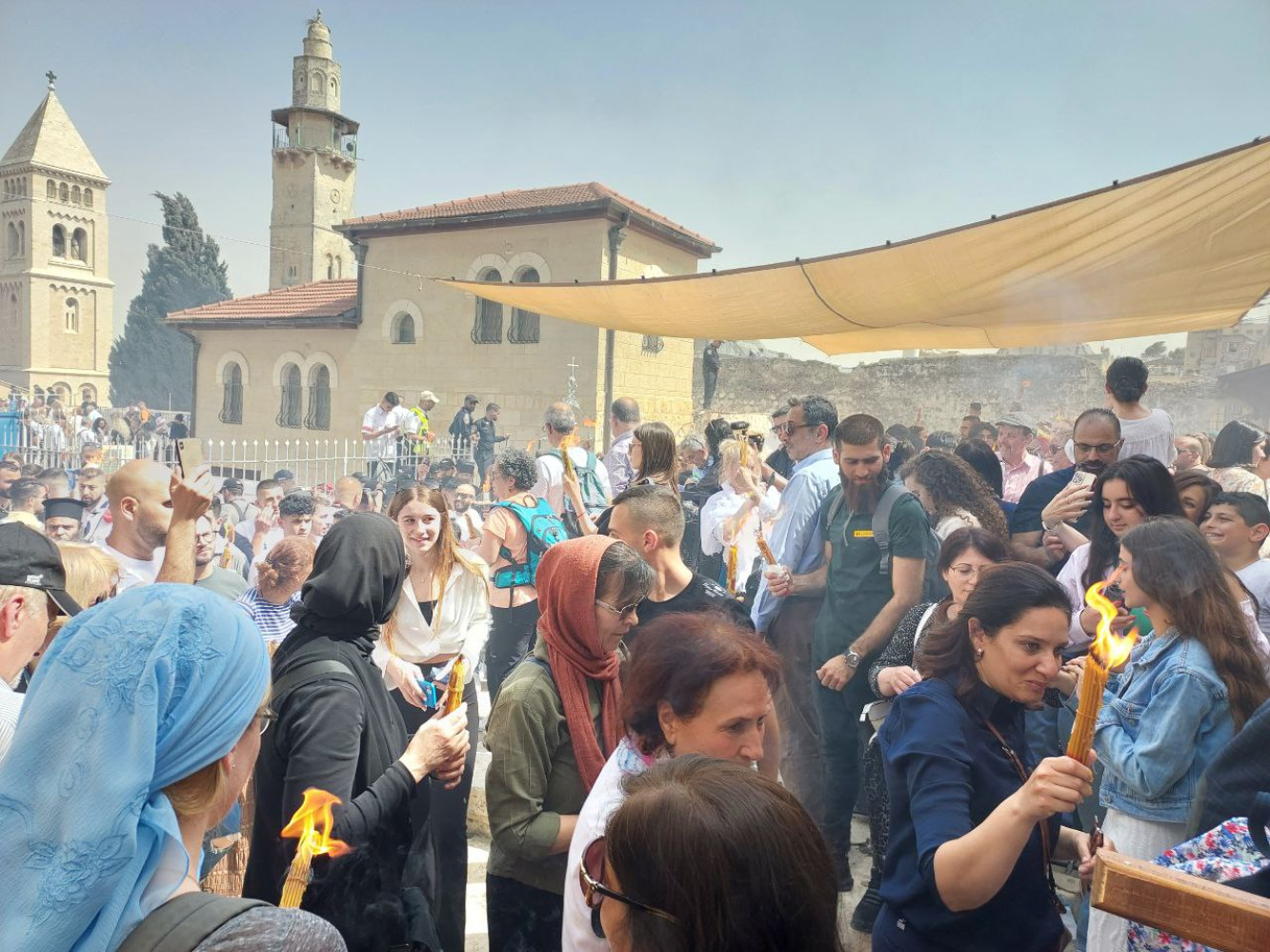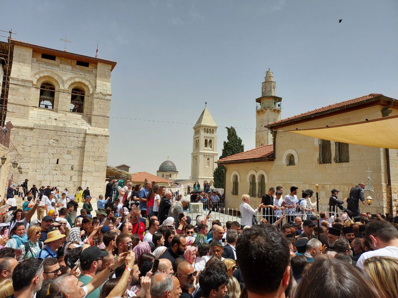 О том, что Благодатный огонь сошел на землю, возвестили всему городу колокола храма Гроба Господнего. В толпе сразу почувствовалось оживление и трепет. Люди замерли в ожидании первых ласточек, которые поднялись на крышу со двора, а когда верующие, уже получившие Благодатный огонь, появились в толпе, каждый пытался как можно скорее зажечь и свою свечу.