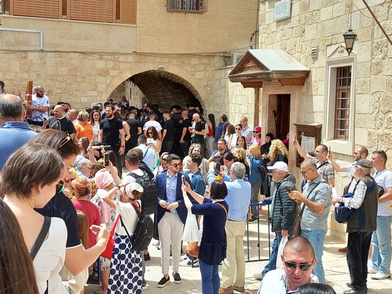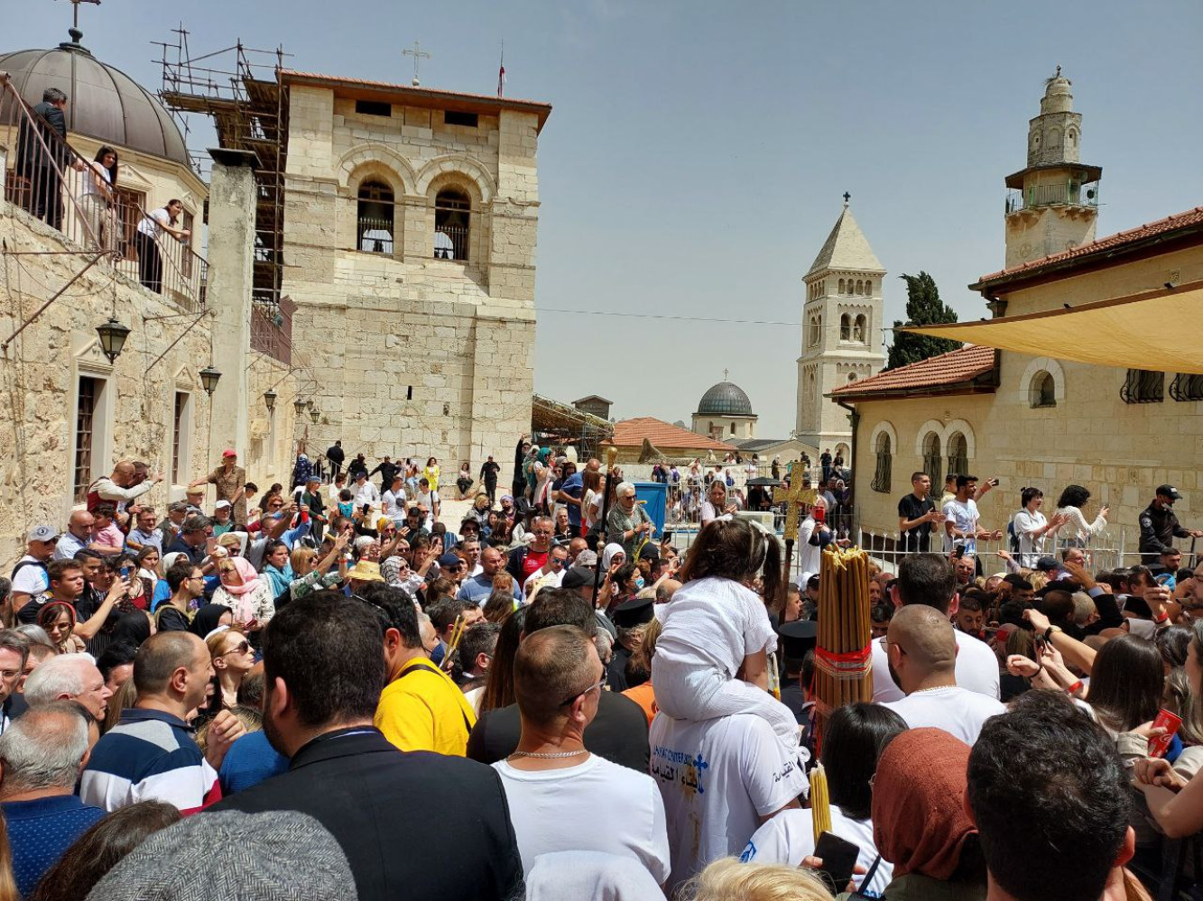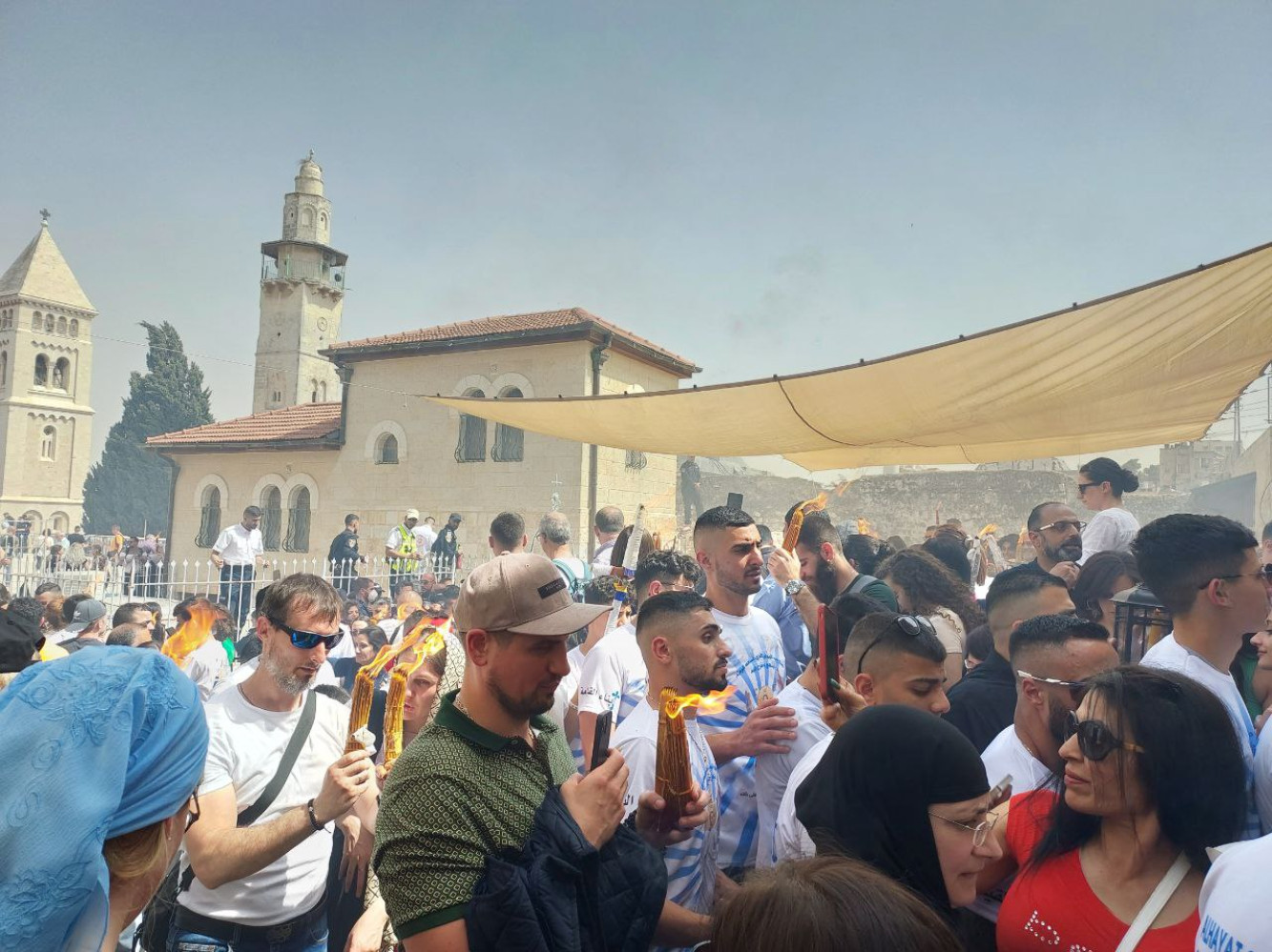 О том, что Благодатный огонь сошел на землю, возвестили всему городу колокола храма Гроба Господнего. В толпе сразу почувствовалось оживление и трепет. Люди замерли в ожидании первых ласточек, которые поднялись на крышу со двора, а когда верующие, уже получившие Благодатный огонь, появились в толпе, каждый пытался как можно скорее зажечь и свою свечу.