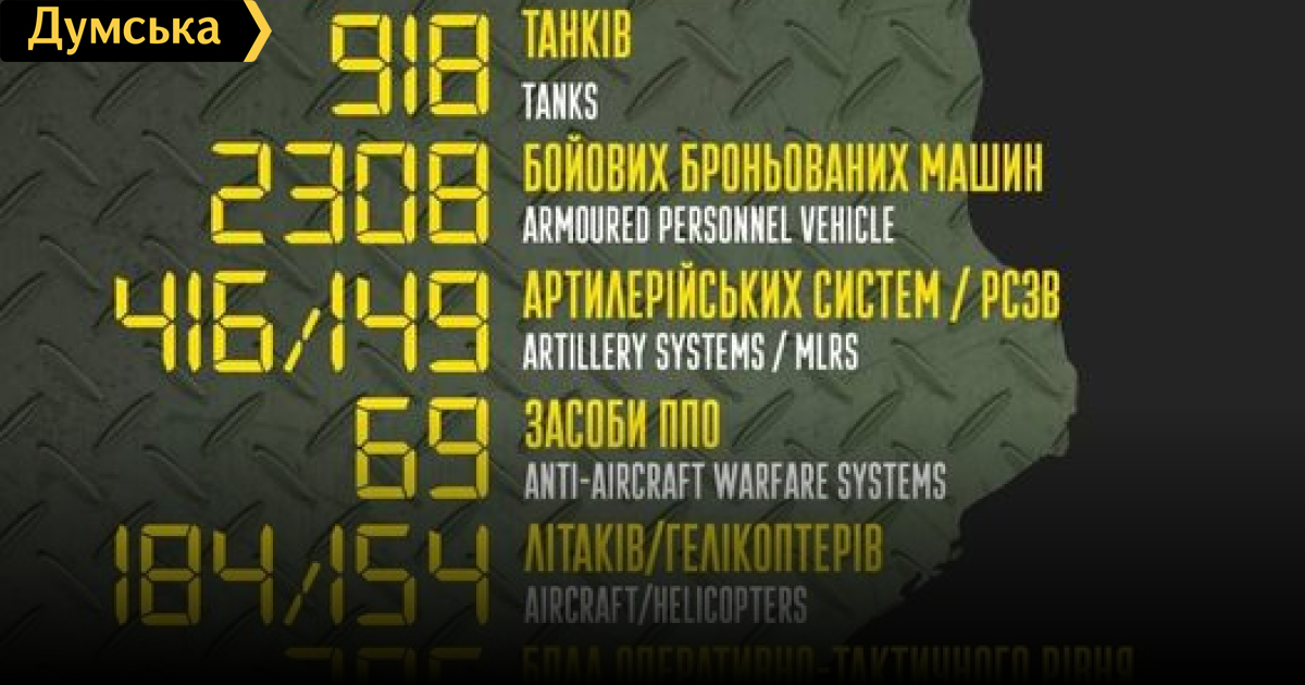 За сутки российские оккупанты потеряли 200 человек, 34 танка и 50 боевых бронированных машин200 солдат и офицеров, 34 танка и 3 самолета потеряли российские нацисты за минувшие сутки в Украине. Кроме того, как сообщает Генштаб Вооруженных сил, украинские защитники уничтожили 5 артиллерийских систем, 50 боевых бронированных машин, 77 единиц автомобильной техники, 4 БПЛА оперативно-тактического уровня и три единицы спецтехники. Всего с начала полномасштабного вторжения потери врага составили: личного состава — 22 100 человек; танков 918 единиц; боевых бронированных машин 2308 единиц; артиллерийских систем – 416 единиц; РСЗО — 149 единиц; средства ПВО - 69 единиц; самолетов – 184 единицы; вертолетов – 154 единицы; автомобильной техники — 1643 единицы; корабли/катера — 8 единиц; цистерн с ГСМ - 76; БПЛА оперативно-тактического уровня – 205; специальная техника – 31; пусковые установки ОТРК/ТРК — 4. СМЕРТЬ РОСІЙСЬКИМ ОКУПАНТАМ! Помітили помилку? Виділяйте слова з помилкою та натискайте control-enter |